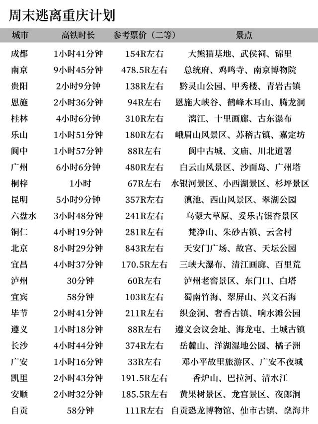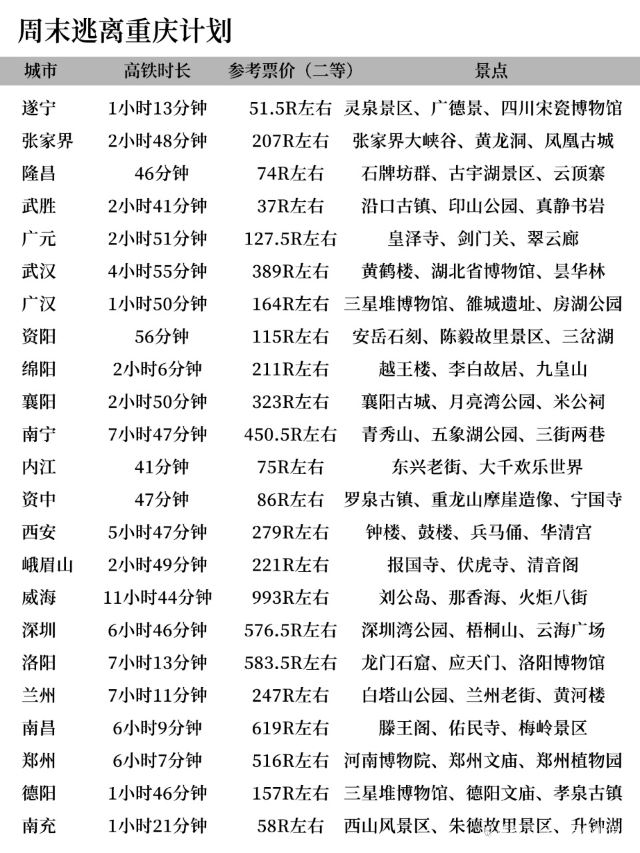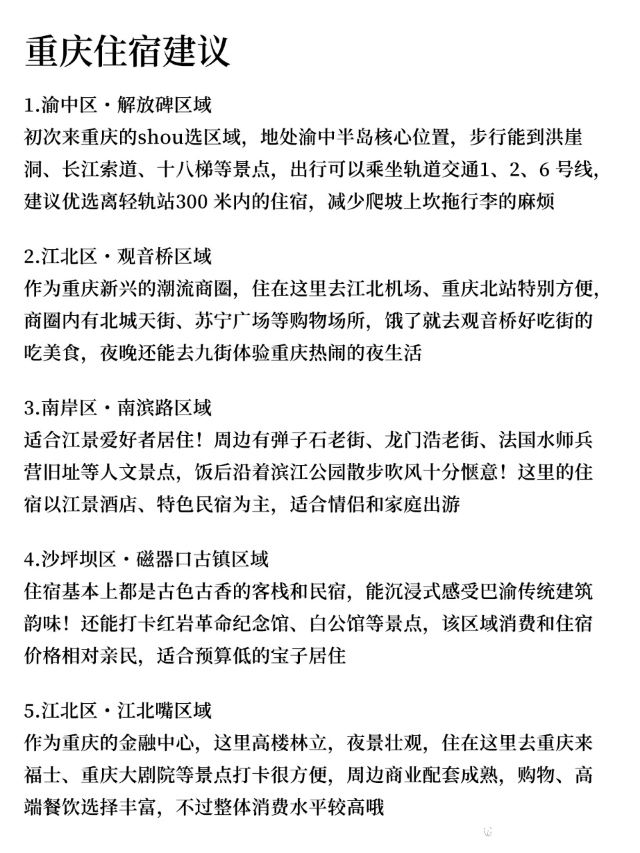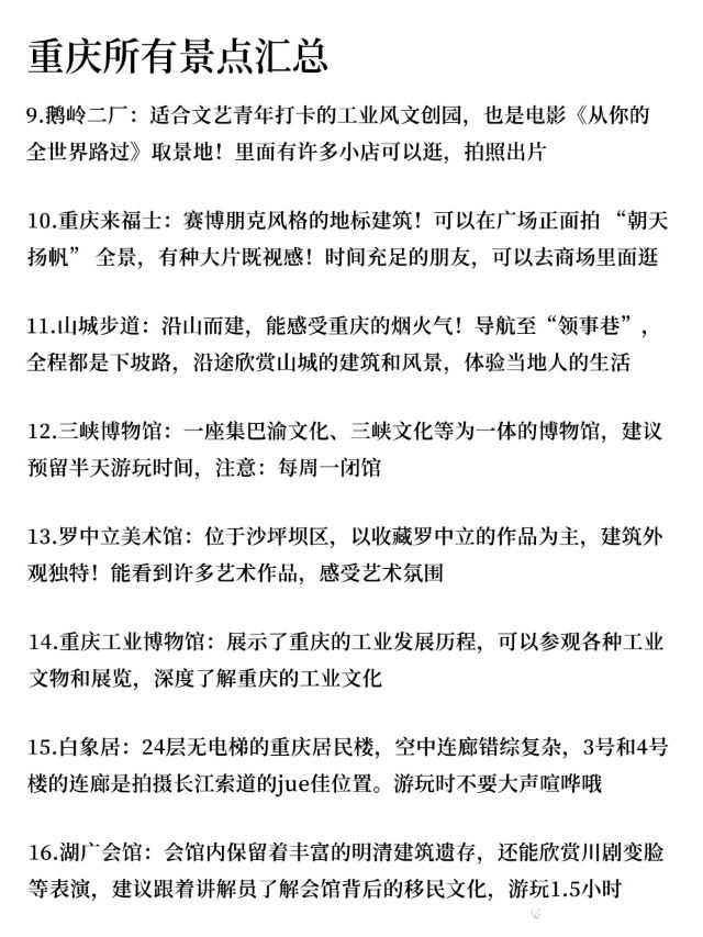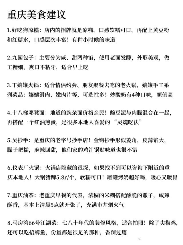 玉米开心加倍整理了一些重庆周边的城市,适合周末可以去玩!!!不想出市的姐妹们👭,可以直接去市内打卡热门景点🎆,真的很好拍!😇顺便给大家分享一些本人亲测好吃的美食🍲~~ - 〽️重庆好玩的景点 🪷洪崖洞 重庆地标性夜景打卡地,真的很魔幻 🪷解放碑 重庆繁华的商业圈和时尚地标,适合购物👛 🪷长江索道 重庆版“空中公交”🚡,主要分为北站和南站 🪷重庆来福士 拍“朝天扬帆”全景,有种大片既视感 🪷山城步道 沿途欣赏山城的建筑和风景,生活气息浓厚 🪷罗中立美术馆: 以收藏罗中立的作品为主, 感受艺术氛围 - 🏠重庆市内住宿区域🥰 💜解放碑区域 💜观音桥区域 💜南滨路区域 💜磁器口古镇区域 💜江北嘴区域 - 🤔重庆美食 🍨丁孃孃火锅 适🈴情侣约会、朋友聚餐去吃!孃孃手工系列菜品:孃孃滑肉、嫩肉片等,盲点不踩雷 🍨仪表厂火锅 需要爬坡上坎才能找到的一家火锅店,大锅猪蹄软糯可口,罐罐烤奶🥤超好喝,暖心又暖胃 🍨马房湾66号江湖菜 七八十年代的装修风格,适合拍照!除了尖椒鸡,还可以吃招牌鱼,香辣过瘾🌶️ 🍨利火锅 开在居民楼下的院坝火锅,138💰买8荤送13素,现切黄牛肉3.8💰一份,很有嚼劲 🍨聂发财来凤鱼 环境宽敞复古,不仅菜品种类丰富,味道还正宗,来凤鱼口味鲜甜,爱吃鱼🐟的宝子可以去 - #本地人做的攻略#换座城市过周末#假期去哪玩#重庆旅游攻略