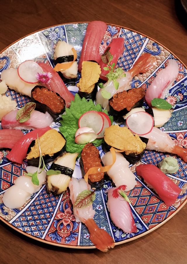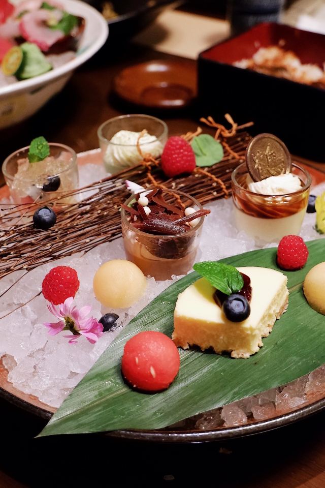 帝王蟹小火锅,精选刺身大拼盘,鳗鱼烧,炸软壳蟹配咖喱酱,火炙M9和牛3种寿司,酸奶芭菲配荔枝清酒汤 ,精选寿司大拼盘