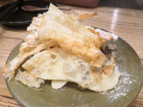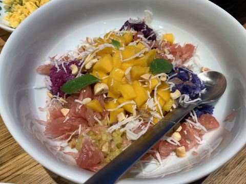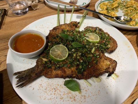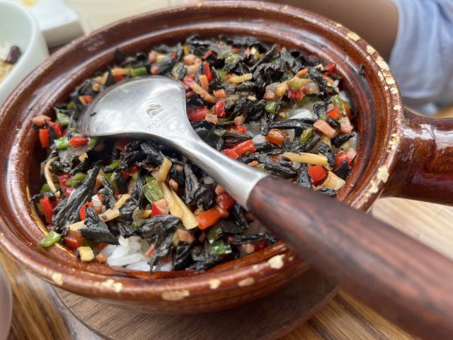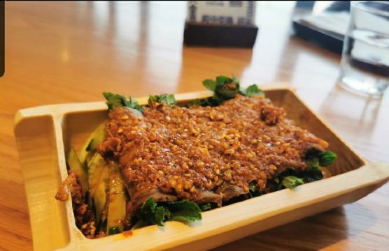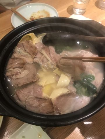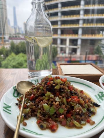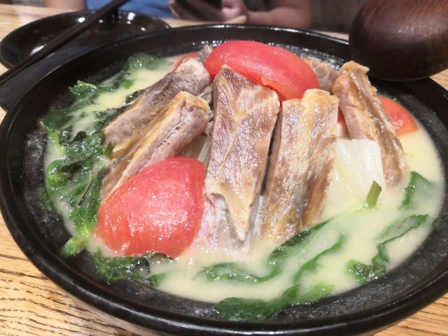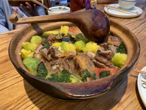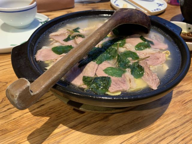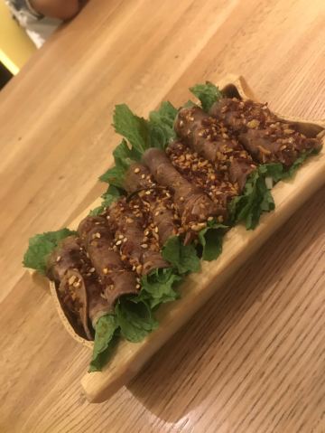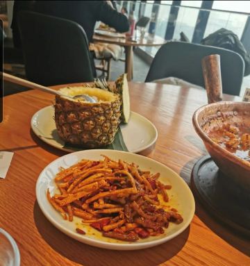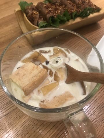 veradan本甄排队太久,就来同层的一坐一忘。 终于把好奇了很多年的“乳扇”弄明白了,炸的,酸酸脆脆。 茉莉花炒蛋,鸡蛋很黄,茉莉花很多,吃完齿颊留香。很赞! 腾冲大救驾,炒饵块来着,味道很赞呀!饵块吃起来像年糕,但切的很薄,入味。娃说这么好吃咋不上推荐菜呢? 薄荷牛肉卷,很特色,中间卷了薄荷叶,别有风味。 腊排骨,居然汤里加了薄荷,个人觉得不搭。都是肋排做的,味道很赞。一锅小份的有10根呢!这个锅里内容丰富,除了腊排骨和薄荷,还有藕、土豆、山药、芋头、芹菜,都切成长条状的。还有番茄块,另外还有两种不认识的菜,一个和豆芽差不多的根状蔬菜,一个有点像南瓜,但好像又不是南瓜。芋头特别好吃。