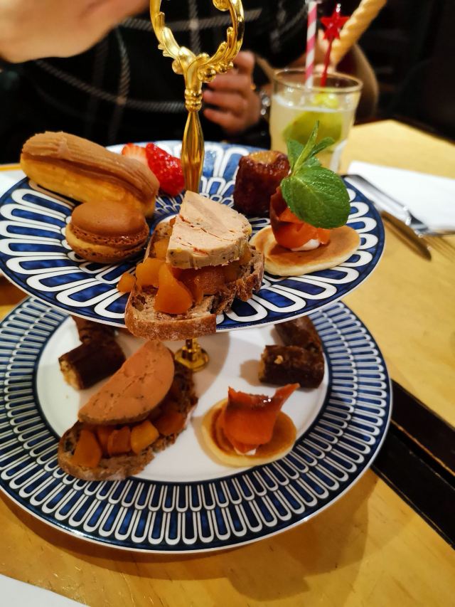 猪头小霸王和弟弟好久没见了正好来静安寺见面就随便找了一家咖啡店想喝下午茶,没想到静安寺的周末很多餐厅都爆满,找了好久才找到这家,虽然在一楼但是还是有空位因为要聊事情也没多想就进去了。 说说环境地方挺大也装修的挺有格调,但是个人感觉这里的东西性价比不高,因为已经四点多了就想说点一点喝的,结果店员硬推荐这里的下午茶那也就算了,三个人点了双人下午茶店员又问了好几遍你不渴吗在点一杯饮料吧[发怒]说真的不渴不饿就是为了谈事情找地方坐才来的,真的有点不喜欢这样的服务。 说一下味道咖啡比较中规中矩,柠檬茶太酸冰块又太对,下午茶拼盘真的量不大,鹅肝还可以就是回味有点偏咸,说一下甜点都做的有点过甜了迟到后面发腻了,到是最后他们家的鸡肉可丽卷算是挽回一点,下次还是换一家店吧。