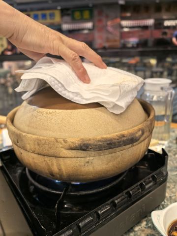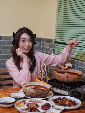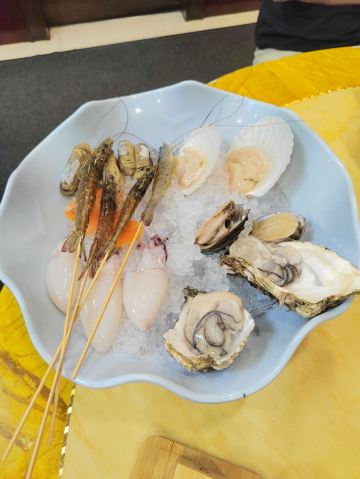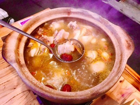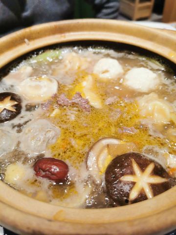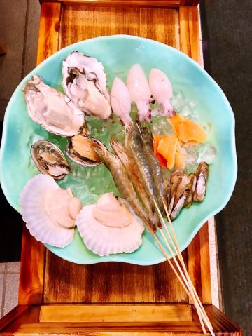 网上团的必吃餐,周日来威皇广福和小海鲜(乌鲁木齐南路店)拔草,环境有特色,怀旧的老香港街头风情,吸引了众多年轻人。 双人餐,内容是招牌滋补醉鸡和七种小海鲜。 招牌滋补醉鸡连煲带炉子端上桌,半个壮实的鸡加菌菇和黑木耳,加少量滋补中药材如枸杞、天麻、红枣、甘草等一起炖煮,加了酒,很香,比一般用黄酒制作的醉鸡酒味要淡一些,更好地烘托了鸡肉本身的鲜美。 七种生海鲜拼盘,有生蚝、小鲍鱼、扇贝、墨鱼仔、活大虾、北极贝、蛏子。可以先吃鸡喝鸡汤,等差不多吃完了,再往砂锅里加水,放入生海鲜,两三分钟捞起。如此操作,海鲜新鲜嫩滑,微微鲜甜,美味!