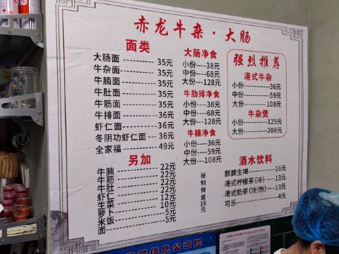 牛杂面,辣椒酱,大肠面,冻柠茶,牛腩,牛杂煲,净肥肠,港式奶茶,汤生菜,港式牛杂,净牛杂,大肠煲(小份)