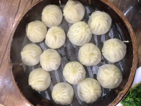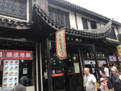 南翔饭店,坐落在南翔古镇老街上的老字号,传统门面,内部陈设也是传统的竹木装饰。传统的八仙桌、长条凳,让人一望而知,是家本帮老店。双休日,人流比较多时,都拼桌用餐,不太习惯。 点了最有名的南翔小笼馒头。私下以为精品化的蟹粉小笼、菌菇小笼什么的,都不如传统的猪肉馅南翔小笼正宗和好吃,皮薄馅大,汤鲜肉香。刚端上桌时是略微有些烫口的,筷子要小心地去夹,防止夹破皮漏了汤汁。送到口边要先吹一下降温,然后咬一小口给皮开个小洞,吸完汤汁,再分两口将美味的南翔小笼馒头完全送入口中,让薄薄的面皮和鲜美的猪肉在口中搅拌融合,好吃的感觉,绝不是浪得虚名的!让人从心底里认可这个南翔古镇最有名的特产小吃。 南翔古镇的白切羊肉也是传统特色菜,用材新鲜,制作考究,完全凉透后切片,摆盘整齐好看,吃起来完全没有一般羊肉的膻味,瘦肉为主,带着一点Q弹的皮,满满的胶原蛋白,夏日三伏天食之进补。 还点了本帮菜酒香草头,简单的家常蔬菜,要炒得生青碧绿,酒香扑鼻,嫩而不生,熟而不老,还是要有点功底的。 去的当日,气温一下子窜升到近37℃,于是冰镇绿豆汤也成了南翔小笼的最佳伴侣。 总体说来,南翔饭店的环境虽然不够清静,但老饭店的烟火气十足,是逛南翔古镇的不错的歇脚处和加油站。