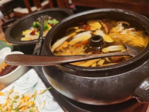 云海肴云南菜,这家店位于本市徐家汇美罗城。生意还可以的。位于徐家汇商业区的云南菜馆里边的菜色种类丰富,味道也不赖。招牌菜就是这家店的特色鲜赤松茸绣球菌汽锅鸡,里边有鲜美的鸡肉,绣球菌,菌菇等料儿。还有冰凉美味的甜品黑糖豆花,滋味好吃爽口。总体而言这家菜馆美食性价比较高的。