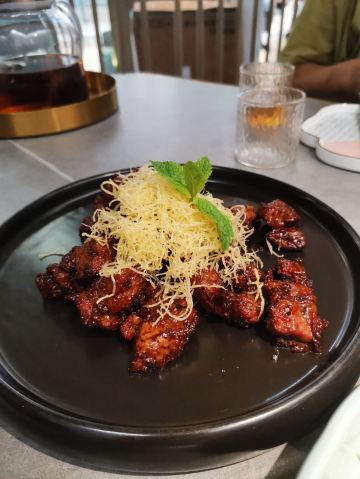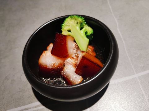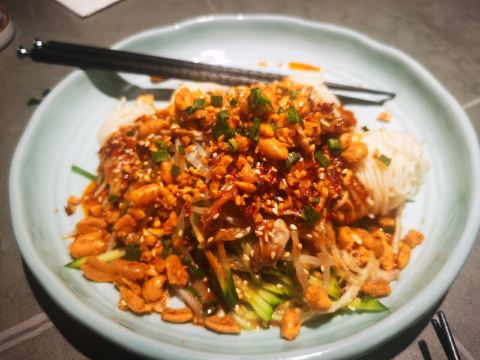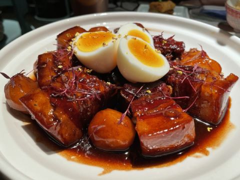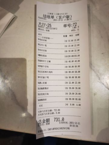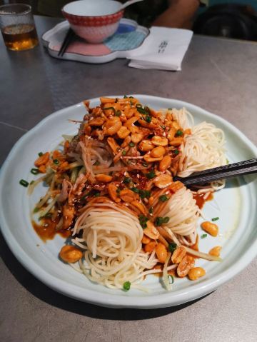 食神牛排了两次队没吃上,下午四点就赶来等位才轮到。店堂不大没有包房,大桌也只能坐6人。装修清新淡雅江南韵味。 菜品为杭帮浙菜加以创新融合,大多都是江南名菜佳肴。 鸡丝凉面32元因为到的早先点了一份垫饥,鸡丝、黄瓜丝、豆芽、花生碎、豆瓣辣酱,满满的堆在柔滑筋道的凉面上,拌匀后咸香麻辣停不了口。后又加了一份。 溏心皮蛋22元用的是鸡皮蛋软滑剔透,青椒泥点缀酱汁铺底别样风味。 话梅熟醉虾39元干冰造型仙气飘飘的样子,基围虾不大弹嫩很鲜甜有淡淡的话梅味。 叫花童子鸡98元荷叶衬底带有微香,鸡皮略有焦黄肥润,鸡肉酥松鲜嫩,汤汁油浓咸重。 桂花板栗红烧肉88元五花肉肥糯酥化咸香甜浓,栗子粉酥桂花飘香。 海胆虾仁豆腐48元浓厚的汤汁中有海胆颗粒非常鲜美,豆腐滑嫩细腻虾仁鲜弹。 家烧宽豆角28元豆角煸的很透皱皮,蒜蓉肉末爆香鲜咸味浓。 黑椒牛仔粒68元牛肉粒外脆里嫩带点筋油,黑椒蛮浓重蒜片爆香。 蟹粉捞饭158元蟹粉绵厚勾芡略重,味道鲜香醇浓,拌上莹润软糯的米饭非常美味。 沸腾鱼虾88元鱼片滑嫩、虾仁鲜弹,红油香辣椒麻浓重。 杭州小笼22元小笼皮上部蛮薄的底壳略厚,肉馅紧致酥嫩汤汁鲜润,味道还不错。 整体菜品味道蛮好,食材新鲜,菜式创意也蛮有特色。环境整洁清爽舒适,服务热情亲切及时周到。
