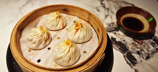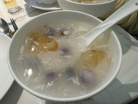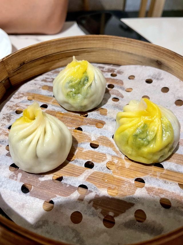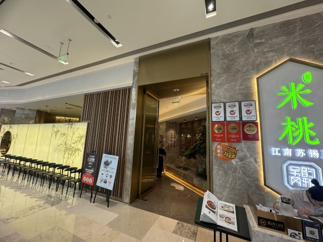 泡泡龙他爸第一次去北外滩来福士,就看到了这家米桃,很醒目,主要是似乎别处没见过这家店,也因为醒目的绿颜色有点俗气。先去了一次,早早11点就到了,发现它家十点半就开门了,这时大部分位子已经坐满,年纪大的居多。门口有仿拙政园的假山,烟雾浏览,周围布置用心,移步换景,曲径通幽,像是在苏州园林中游玩、品茗。挂着许多昆曲角色画像,整体装饰素雅,不知门口为啥弄得有点艳俗。号称苏州无锡菜,尝试下来更像无锡菜,主要特点就是甜,那个无锡蟹粉小笼包,虽然有思想准备,还是被狠狠甜到了。银鱼土鸡蛋炒得不错,看到别人的松鼠桂鱼样子蛮好,下次全家一起来可以尝尝