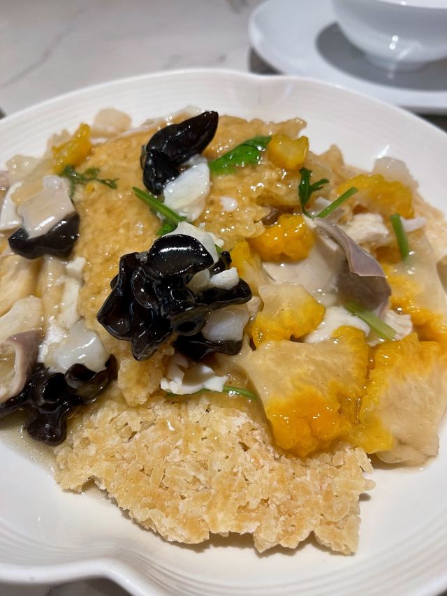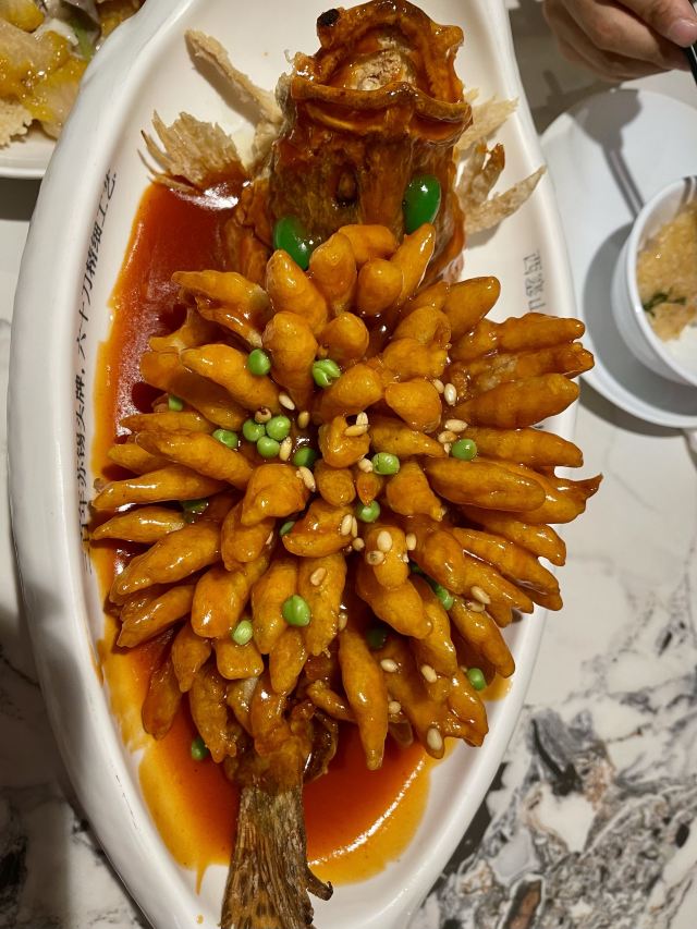 泡泡龙他爸终于全家一起来了,中午来的更早些,十一点不到,换到了另一个房间,这时人少还可以拍些照片。园林式曲径通幽的布置,私密性比较好,但环境非常难拍照,很难避开其他客人还有服务生。要了松鼠桂鱼,特意关照少放糖,服务生有点惊讶,总算端上来还是蛮惊艳,厨师也确实糖放少些。被关照在八分钟内鱼的口感最好,确实如此。不过,最后打包带走的砂锅咸肉菜饭竟然也有些甜味,看来这确实是家无锡菜馆,和苏州园林没啥关系。还有看到人人拿了杯南瓜汁喝,不知什么讲究。价格适中,服务态度好,所以生意也挺好,离开时发现外面已在排队叫号。没有洗手间,在商场内比较远的地方。扫码小程序点单,下单后要注意检查是不是自动给添上一包餐巾纸,这个完全没必要。万一支付了,可以要求餐厅退款。吃了两次,重要品种都试过了,过甜,家人应该以后不会再来了,特别是小年轻不易接受这比较传统的口味