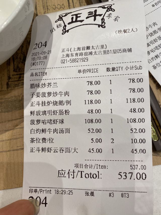 泡泡龙他爸据说前滩太古里月底开张,周末就去了一次。来的太早了,应该再等半年。试营业期间就开始收停车费了,但保安做事全无责任心,进车库的路被莫名其妙堵死也眼看着放任不管,还是我下车处理解决的。里面绝大部分商铺还在装修,粉尘味浓,似乎也没有什么特别好的餐厅开张,都是些常见的人家。转了半小时,赶快吃个午饭打道回府。这时也只有正斗营业了,餐厅紧靠地铁入口,位置不错,但装饰色调俗气难看,还不如已关闭的墨绿色调港汇分店。里面空间大,挑高足,还有雅座空间,11点不到已经开始营业,虽然大部分服务生还在听训话。扫码点菜,品种多,多到在手机上觉得怎么也看不完,似乎不少点心在不同的类别中重复出现。有茶位费,5元一个人,普洱茶,可以选择不要。点心做的不错,只是空气中忽隐忽现装修和粉尘味道,抓紧吃完赶快闪人。发票是电子的,小票可以自助进行商场积分,味道虽挺好,但这家正斗以后再来的可能性不大