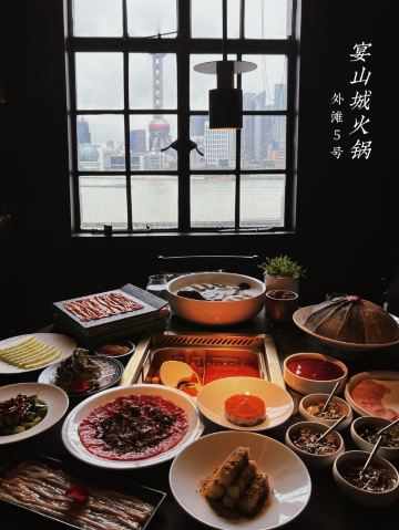 有客户从河南到上海,朋友请客,邀我陪吃,看到是外滩五号地址,而且还是个火锅店,吃了一惊。外滩本来就极少去,那地方不是我等平民百姓消费的地方,朋友说价格团购的话不贵,用不了网上所说的人均700-900。查了一下,中午的团购四人餐是700不到,这个差别太大了吧,去长长见识。乘车沿广东路接近外滩下车,北侧就是外滩五号,小小的电梯直上,六楼被两家餐厅分享。走进宴山城,静悄悄的,暗色调,远处隐约可见几个服务生,门口没有接待生,奇怪,难道和团购价格一样服务也打折了吗。进入包房,环境看上去还不错。火锅是由服务生帮客人涮,吃到薄薄的一片牛肉,一片据说东海大黄鱼肉,一片腰花,还有些什么没搞清楚,稍稍实心一点的就是那小小一碗炒饭。吃不饱的,回到公司拿了一片饼干填肚子。有一个包房,还有几个沿窗座位是可以看浦东风景的,我们包房朝内侧,什么也没见到。如果是普通餐厅,服务没问题,如果真是网上写的那个价位的话那服务是远远配不上的。中午客人很少,这里只是吃情调的地方,没啥兴趣再来了。哦,不要说包房,整个餐厅是没有洗手间的,要到楼层洗手间去,总算还很不错