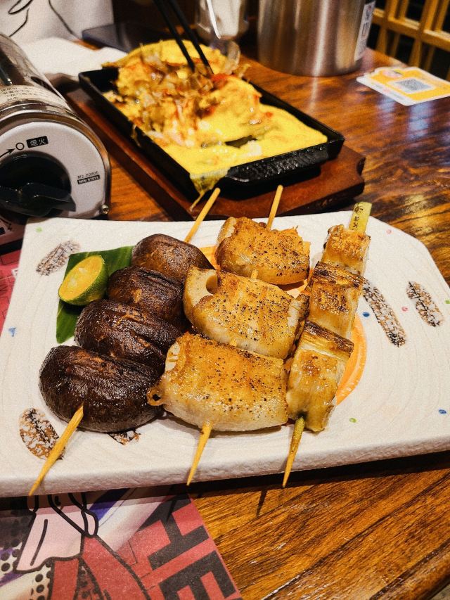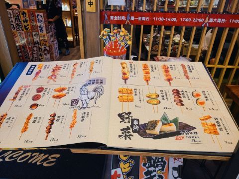 鸡提灯,玉子大阪烧,莲藕明太子,厚切牛舌,烧鸟饭,抹茶大福,富士山寿喜锅,寿喜锅,串串,鹅肝