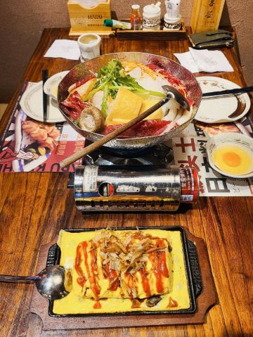 🍳玉子大阪烧,一下子就能吃饱 2022-11-4 先要感谢小伙伴的BW腿,带着艾小米飞,毕竟现在好难中的🙃 【环境】 坐了一个有披头士元素的小小半包房,两个人色色一一闷在那里自由自在 座位不需要拖鞋,跨进去就好了 整个餐厅的居酒屋氛围还是很强的,也看到了好多个一人食旅人的感觉,真是不错的氛围感 【口味】 |富士山寿喜锅^79.9,主要是四片挺大的牛肉,然后配上鱼竹轮小年糕豆腐黄芽菜,其实豆腐很好吃,因为可以吸满甜甜的寿喜汤汁,开动之前,艾小米就告知小伙伴,自己很爱寿喜锅的酱油汤😅(因为是第一次和这个小伙伴一起寿喜锅),小伙伴表示自己从来不要喝寿喜锅的汤😂 |玉子大阪烧^38,四枚,全场最佳的一道菜,鸡蛋非常嫩地包裹在外面,而且这个鸡蛋有特别的蛋香,就是真的好饱,艾小米在喝下几碗寿喜汤汁之后,就再也吃不下第二只了... 这一套算是单人套餐,吃惊了😨两个女生结果也没吃掉,打包了最后一枚玉子大阪烧,还有三串烤物,打包盒2米,是那种比较好的外卖包装盒 【服务】 可能选的小哥哥小姐姐们都不是很适合在日料店服务,说话口音都很重,一秒钟就出戏居酒屋氛围感,倒的茶水几乎是冷的,向小哥哥提了能不能换一下,小哥哥爽气回答:因为外面天气冷,倒出来很快就冷掉了 ...... 当天室外温度18度,并且也不是坐在户外露营区,是在中华第一街的高档商场世茂商场里的店铺内部,直接从茶壶里倒出来的水直接就是冷的...竟然能想出这么个理由来也是服气 打卡可以送大福,根本没有人提醒,和之后去的同样是日料店的金焰食堂打卡大福服务相比,真的是天地之差了 果然,没有对比就没有伤害