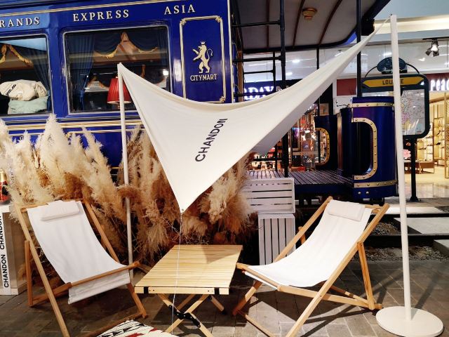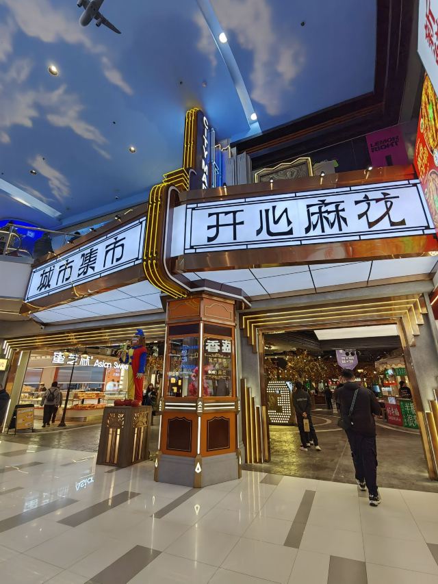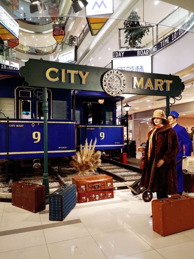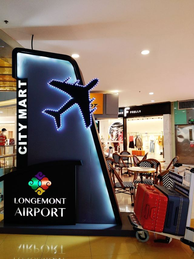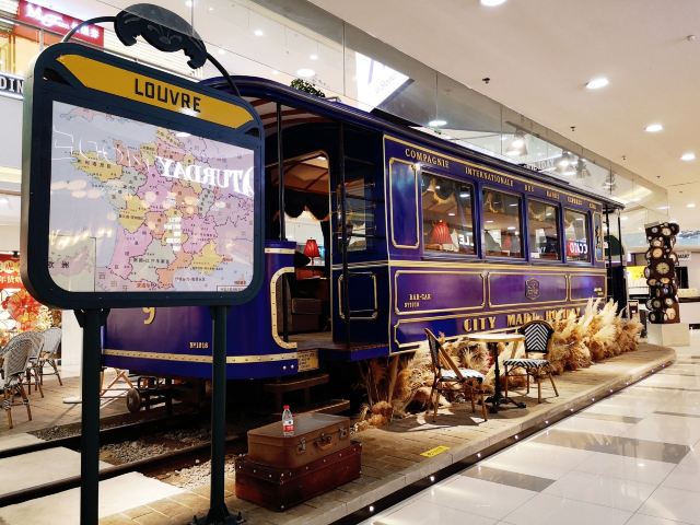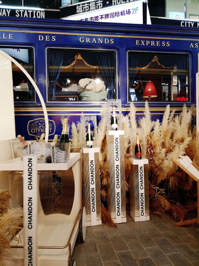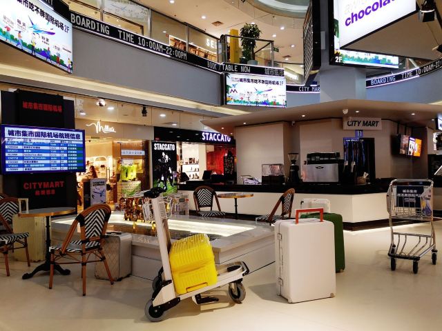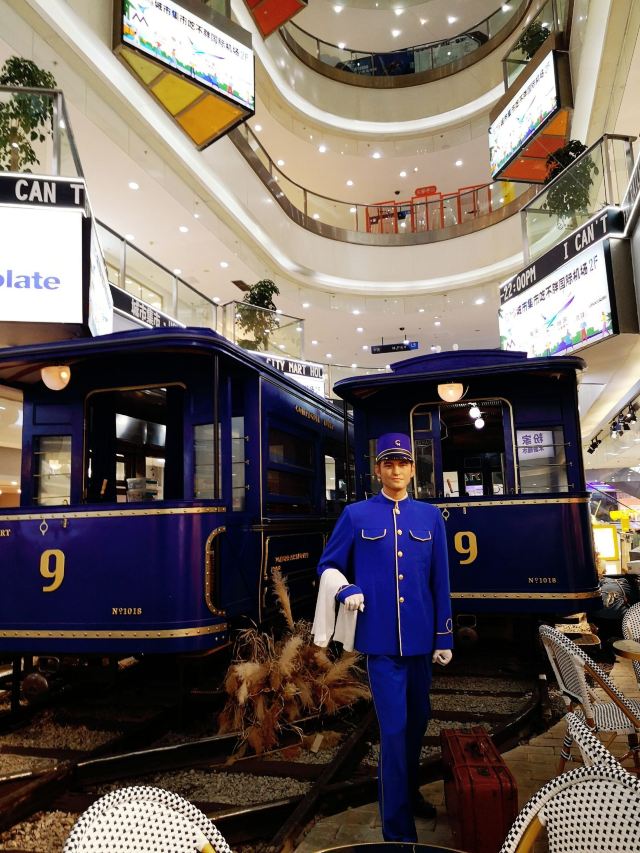 蓓家温暖又是阴瑟瑟的落雨天,城市不会困住人们对旅行的向往,我要出发了,在吃不胖国际机场候机厅旅行箱、皮箱、推车一应俱全,不断滚动的航班表、各种机场导示……侬晓得这个吃不胖国际机场在哪里伐?! 【CITY MART城市集市】龙之梦购物中心2楼打造“轻度假”主题餐饮区--CITY MART HOLIDAY吃不胖国际机场~引进8个品牌,主要为咖啡、茶饮、甜品品牌。火车和机场两个区域由日不落小酒馆相连接。 【机场区】蓝白为主调的机场区设置了行李传送带打卡区,大屏轮流播放由品牌组成的时刻表。还有波光粼粼的金币许愿池,仿佛将《罗马假日》中的许愿池搬到了魔都,金色的“CITY MART HOLIDAY”立牌也金光闪闪,在许愿池区域,还是和航班信息显示屏合影的最佳机位。这一艘巨型火箭将近 3层楼的高度让人感到无比震撼,视觉和听觉双重冲击,还可以“点火”,感觉下一秒它就要飞入云霄了!见不到真正的火箭,就来这里和火箭合影吧。 【火车区】火车区将两节蓝色复古火车搬进购物中心,复刻欧洲火车样式有致敬东方列车谋杀案的意味。蓝色复古火车好漂亮,进入餐车厢内部,靠车窗设置了6个面对面双人沙发座位。蓝色的窗帘和蓝色的靠垫构成了车厢内的主色调,与餐桌上红色的台灯形成对比,在木质地板的映衬下,度假仪式感满满。在这里用餐小憩看看窗外风景宛如正在经历一场欧洲火车旅行,谁能想到这是一场原地旅行呢?! 下火车去露营区芦苇丛中的沙滩椅上喝着小酒迎接落日,轻轻松松就将度假仪式感拉满,跟着我一起来奔赴这场摩登假日之约吧!