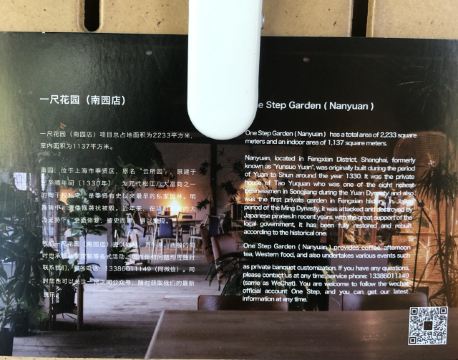 一尺花园(南园店)位于上海市奉贤区青村镇青溪老街南园内,原建于元至顺年间(1330年),是奉贤有史以来最早的私家园林,在这栋有历史故事的老宅里,喝咖啡,赏美景,温馨惬意。