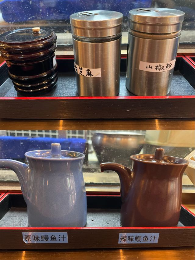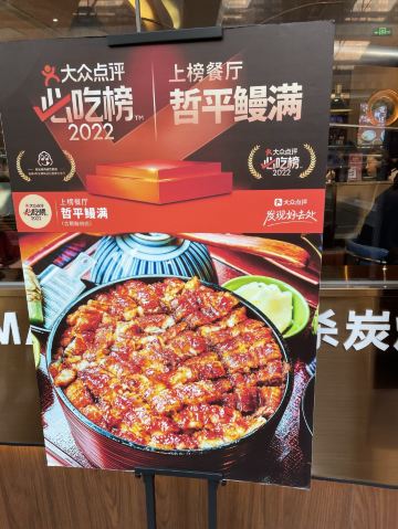 哲平鳗满·活烤鳗鱼(正大广场店) 来吃鳗鱼饭 名古屋式鳗鱼饭小份 目前有团购98元 点单后大约等了10分钟左右鳗鱼饭就上来了,店员还热情介绍鳗鱼三吃吃法。三吃还是喜欢原味什么都不加,烤鳗鱼尽管肉不是很厚,但是外脆里嫩,现烤的。 店内看到有鱼缸里面有鳗鱼养着,也能看到现场烤鳗鱼。米饭和小料不够的话可以和店员说,免费加的。
