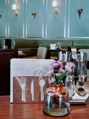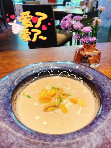 BAI CAN TING🌼环境:店面很大,门前的一排小黄花映衬着白餐厅蓝色的遮阳篷,蓝黄相对的颜色很显眼,餐厅面积比较宽敞舒适,餐桌很多,靠墙沙发座也比较舒服,每桌都有小鲜花,很有春天的气息,整体环境低调雅致。 💁服务:服务员都很亲切客气,进店入座,会有免洗消毒液提供 「白餐厅自制餐前面包」感觉面包有点老,不是很香。这家的餐前面包不是配黄油,店家建议配黑醋和橄榄油拌着食用,还有专门文字过程贴着吃法,比较特别。 「西班牙进口24个月伊比利亚黑猪火腿」口感略咸,配合着芝麻叶食用感觉不错。 「提拉米苏」喜欢最上层香浓的感觉,下层蛋糕浸润在红酒里有些湿润的口感不是最喜欢。 「每日例汤」口感还是比较浓郁的 「鹅肝牛排」这家白餐厅的特色牛排配上一大块鹅肝在牛排上,味道不错,摆盘也漂亮, 「意大利面」和闺蜜一起用餐,面的量比较大,也比较入味,就是面条硬了一些。 「柠檬可乐」店家提供了玻璃杯和柠檬片配可乐。 📍地址:智星路95号(创智天地企业中心3号楼1楼)工商银行后面 🚇交通:地铁10号线江湾体育场站10号口步行6分钟