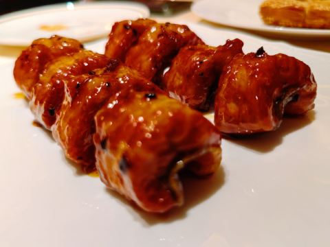 烤乳鸽,清蒸马友鱼,茉莉花柠香马蹄沙龙眼黄耳,爆汁香葱牛肉饼,金腿榄仁龙虾炒鲜奶,干炒牛肉陈村粉