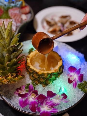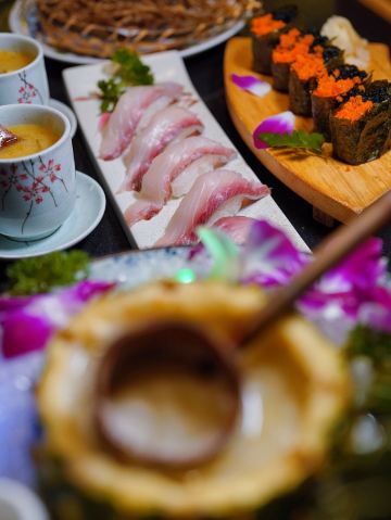加油干饭呀这家日料放题有点厉害👏繁华似锦的刺身拼盘一上桌,乍看以为搬来了一座海底龙宫,各种生猛海鲜争奇斗艳,一口气吞下整个太平洋的节奏🌊 Toshima丰岛日本会席料理,真的是一座人间宝藏,论品质绝对是日料界天花板,一口就值¥100的蓝鳍金枪鱼大腹,搁在放题店里绝对属于上桌秒没的贵价货。 比甜虾大好几个size的牡丹虾,三文鱼、北极贝、象拔蚌应有尽有,一口气打卡十几种刺身,还有一整只北海道红毛蟹神助攻,用来煮火锅有种锦衣玉食的高级感🦀️ 据说每一只生蚝都藏着一片海,那就吃一口🦪烤生蚝🦪,听一听海哭的声音吧,无可比拟的新鲜程度,专治老饕各种不服🌝 活久见的🐟杨枝鱼🐟,仪式感满满的🔥火焰海螺🐚,还有外脆里糯的🍥麻球🍥,恨不能向天再借九个胃,把菜单全部都滚一遍~ 最后必须夸一夸🍍菠萝烧酒🍍,冰冰凉凉好喝到上头🥰菠萝为碗自带果香buff,每一口都伴随水果的清甜和烧酒劲爽,配上肥而不腻的香煎鹅肝,简直太绝了‼️
