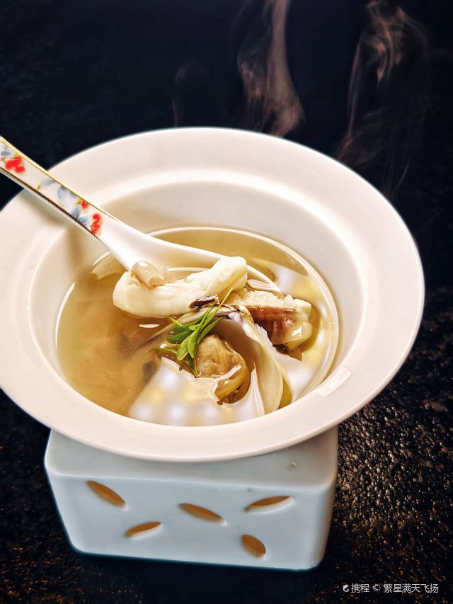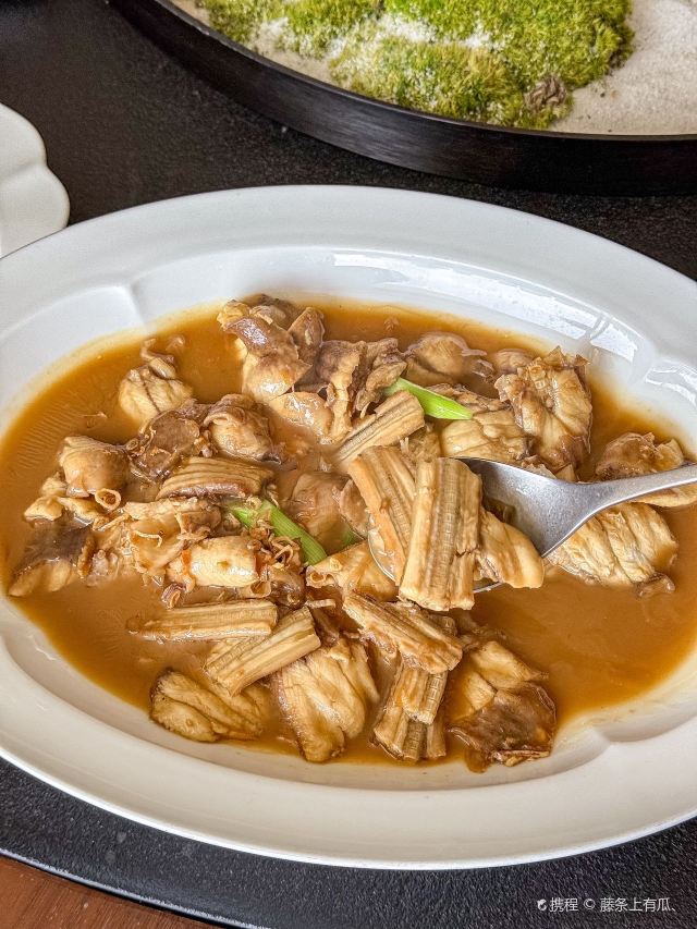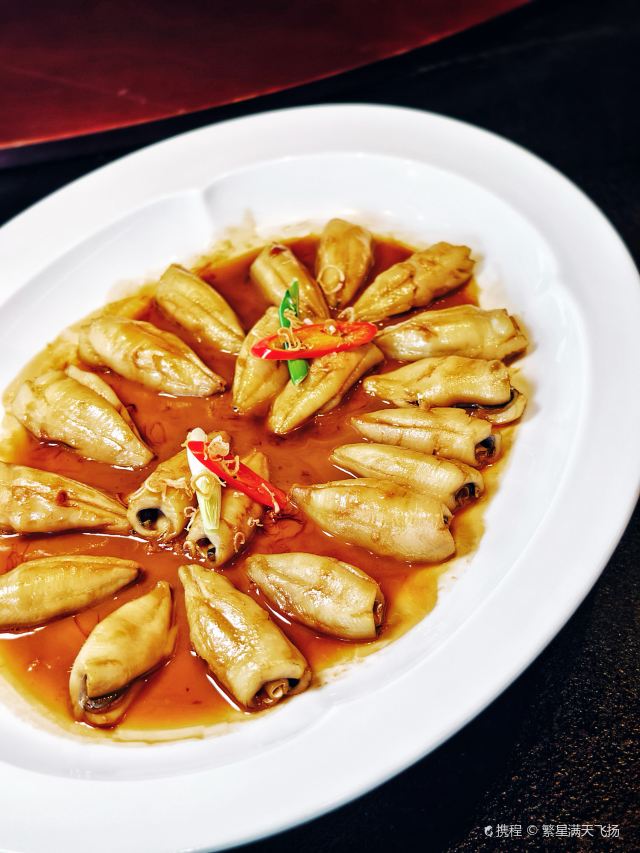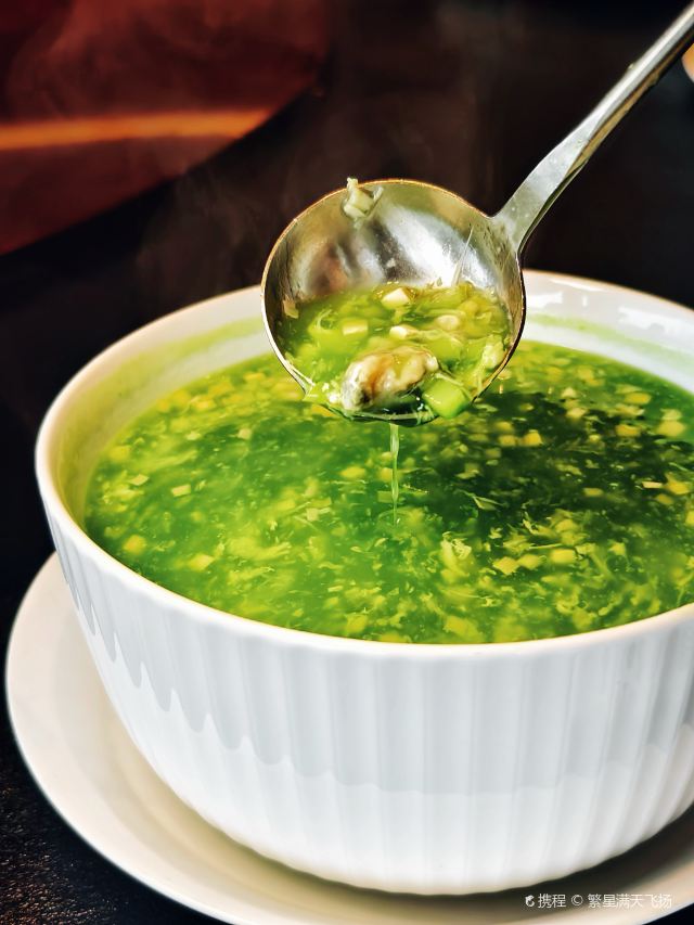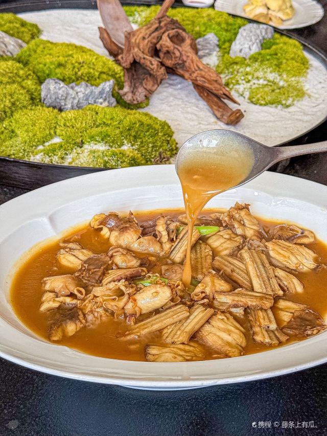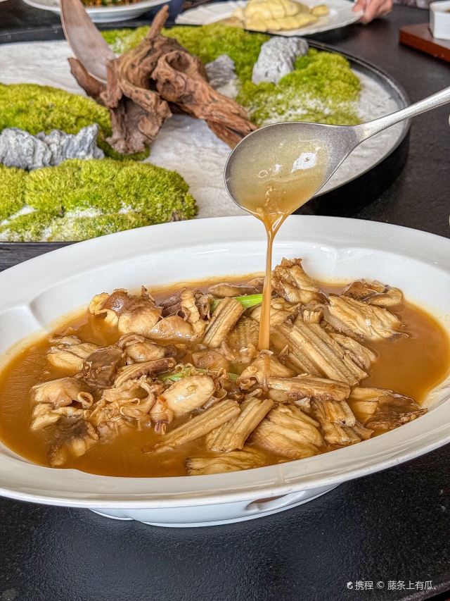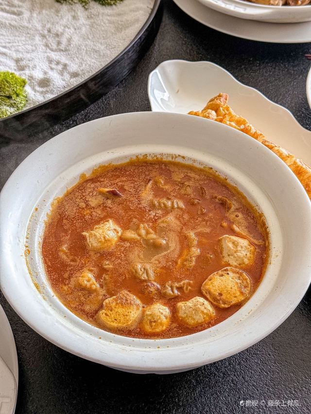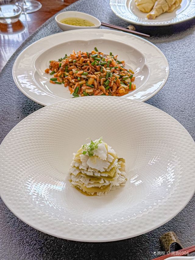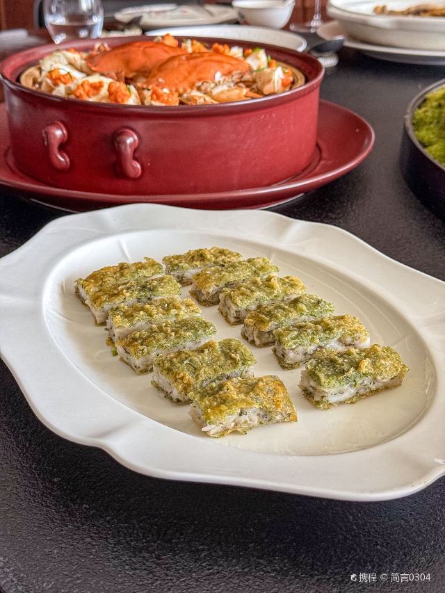 繁星满天飞扬杨浦是越来越让我欢喜了,总有新惊喜闪现。北外滩的玻璃幕墙外,黄浦江泛着粼粼波光。绕过码头,闽地春日的山海滋味已然铺展。 白灼东山手钓大管 白灼大管最考验食材本真。半掌宽的东山岛大管对剖如弯月,焯水时精准掐算秒数,入口脆嫩弹牙。主厨在顶端撒了莴笋干碎与青椒末,如同给白玉佩了翡翠璎珞——莴笋干的酥脆碰撞柔韧的管肉,海潮鲜甜里迸出春笋破土的清冽。 纹斑竹鱼两吃颇有巧思。鱼肉切片涮烫,带着一缕缕肉纷,紧而不散。鱼骨与文蛤共煨的奶白浓汤里,九层塔香气如闽南三月的风,卷着海港码头的烟火气扑面而来。比起经典的炣烧,我而爱这道透着香的奶白浓汤,不克制,也不张扬。 圆种糯米蒸松叶蟹 拆出整块蟹腿肉覆于油润米粒上,蟹膏融成凝脂灿在饭隙。不同于红蟳的浓郁,松叶蟹的清甜更衬得糯米甘香,让人想起雨后竹林里冒尖的春笋。 牛奶根焗长汀河田鸡 揭开砂锅的那一瞬间,山野气息漫溢。这种闽北特有的药根,也许跟五指毛桃同源吧,就连气味都有一些些的接近,在高温逼出类似椰香的木质芬芳。鸡肉吸饱了草本精华,皮脆肉嫩,恍惚看见戴云山脉晨雾里采药人的竹篓。 荠菜苦螺羹 分明是春日的具象化。螺肉在碧色清汤里若隐若现,荠菜汁滤得极净,只留一抹青草香。汤未入口,先嗅到雨后田埂的湿润气息,味如惊蛰微雷,在喉头轻轻炸开。 水仙茶奶冻 上层冷萃茶汤清透如琉璃,下层奶冻凝若羊脂。银匙破开时茶香与乳香缠绵升腾,仿佛晨露从水仙花瓣滚落,在武夷山涧碎成万千晶珠。 压轴的泉州润饼摊开春之画卷。胡萝卜丝、海苔碎、花生酥在薄饼上铺出斑斓色谱,甜辣酱是点睛的朱砂。咬下时脆响如踏碎枯枝,内里却包裹着湿润春意——这是闽南游子认亲的味觉密码,少了任何一味辅料,也便算不得舌尖的归乡了吧?! #美食旬味会 #美食林餐厅打卡