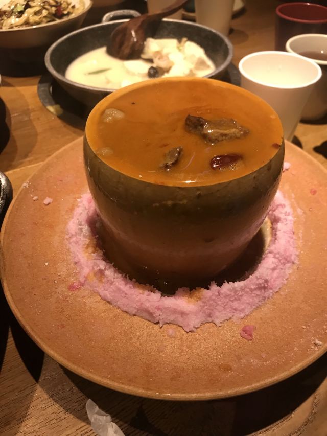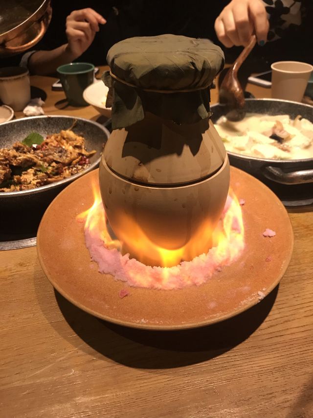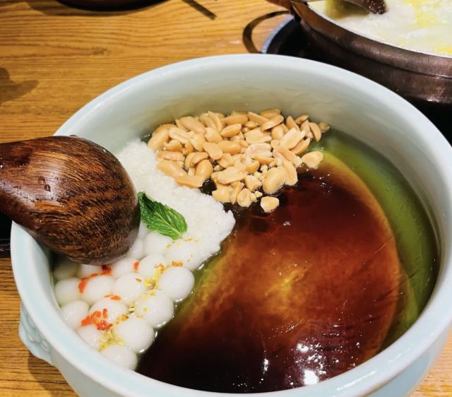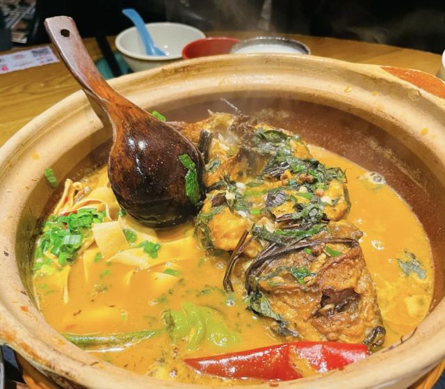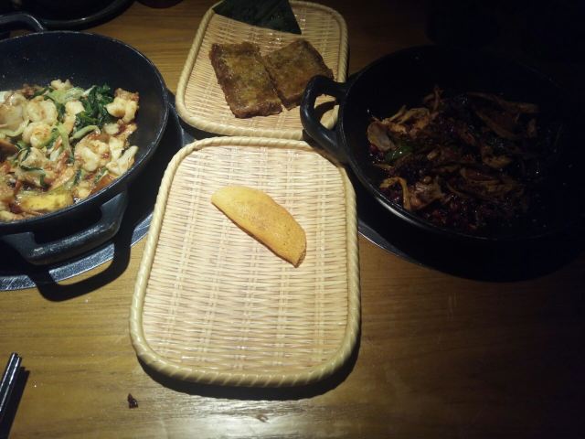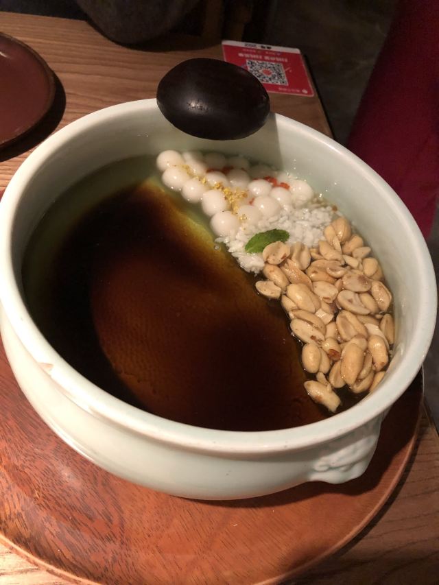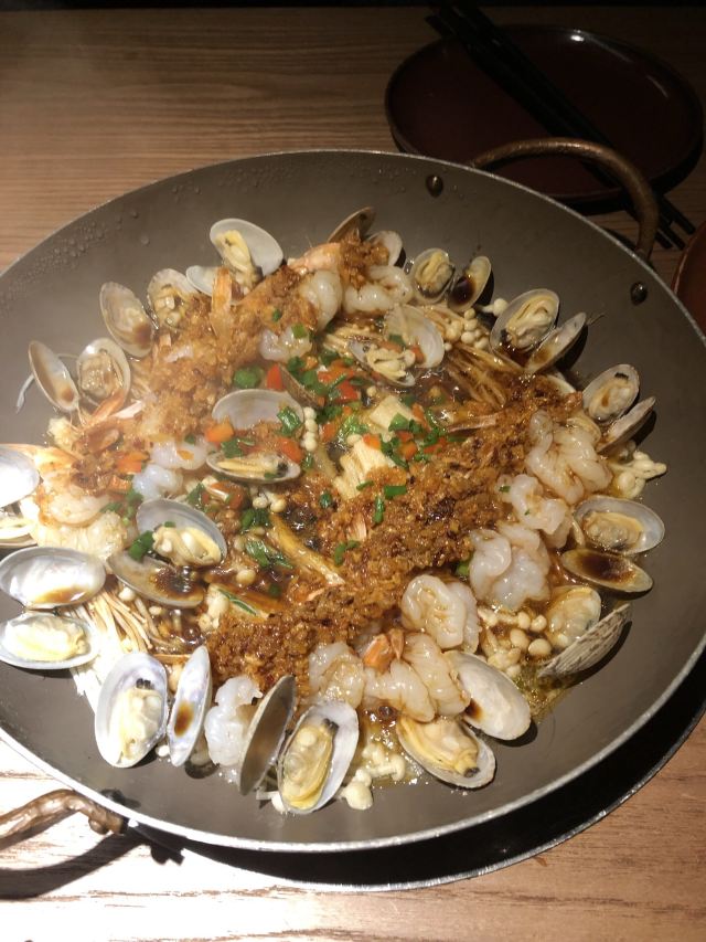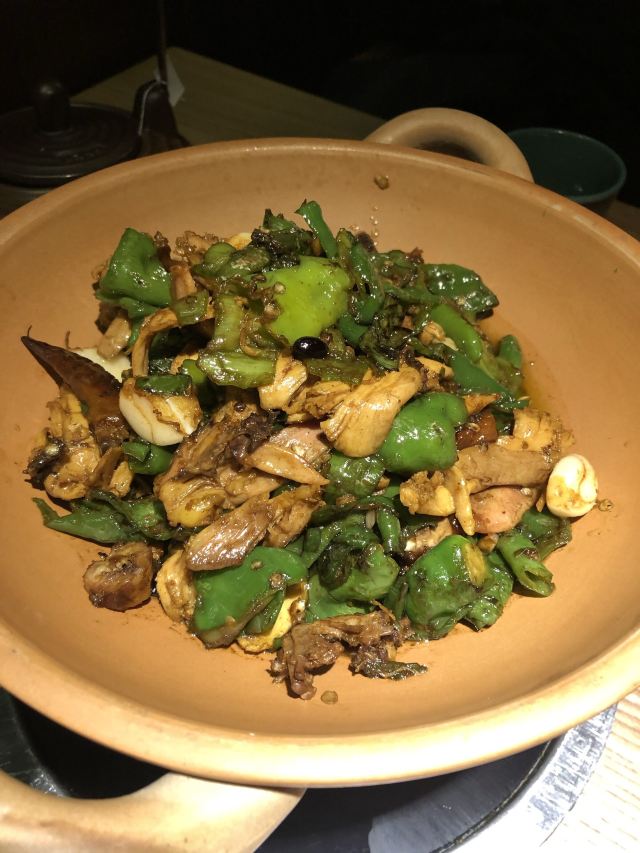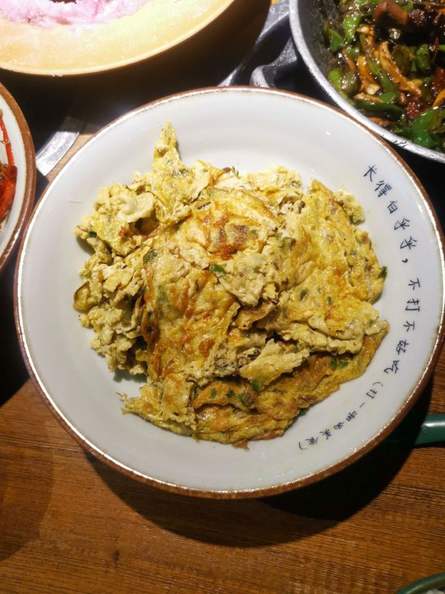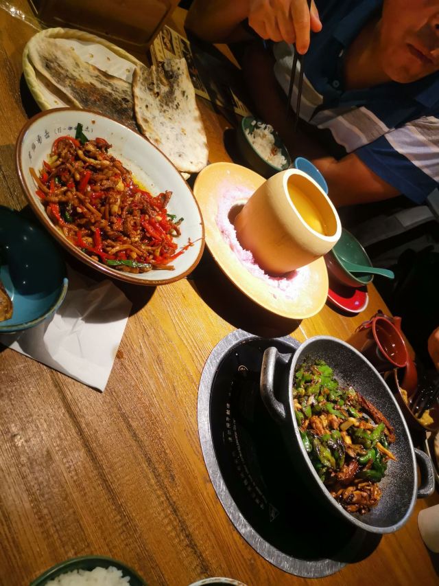 一直排队的餐厅,主打土菜,点单形式挺特别的,扫条形码点菜。 擂辣椒烧手撕鸡,鸡皮很香,但辣椒很多。 锅里的脆脆虾,焖烧虾、花蛤和金针菇,很香很香。 咸蛋黄茄子,挺好吃的一道,吃得到沙沙的感蛋黄。 红糖冰粉,清爽的甜品。 唯一缺点,每个菜都很油,非常油。