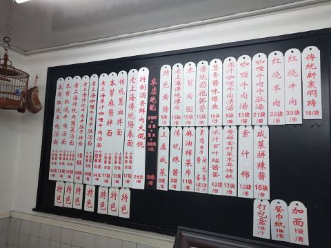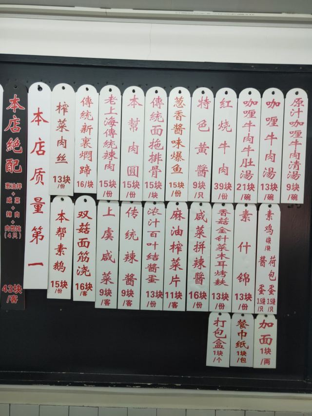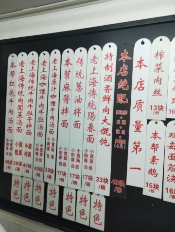 老上海传统阳春面,老上海传统炸猪排,咖喱牛肉汤,本帮麻酱拌面,特制酒香鲜肉大馄饨,荷包蛋,上海传统面拖排骨,来上海传统阳春面,来上海传统炸猪排,素鸡浇头,咸菜,百叶结酱蛋,辣酱,黄鱼面,素鸡,酱汁大肉,红烧羊肉面,鳝爆虾,生切面,传统阳春面,牛五花肉,牛肉干拌面,冷面,赤豆刨冰,上海黄酱,葱拌加面,上虞咸菜,葱油拌面(小宽面),炸猪排