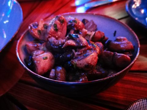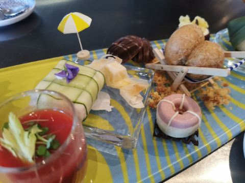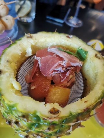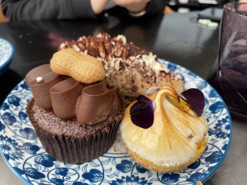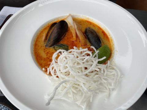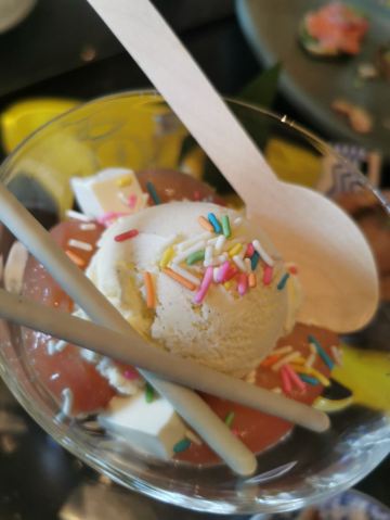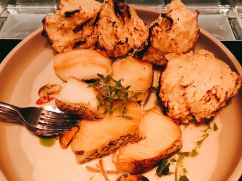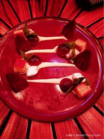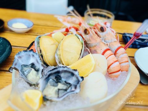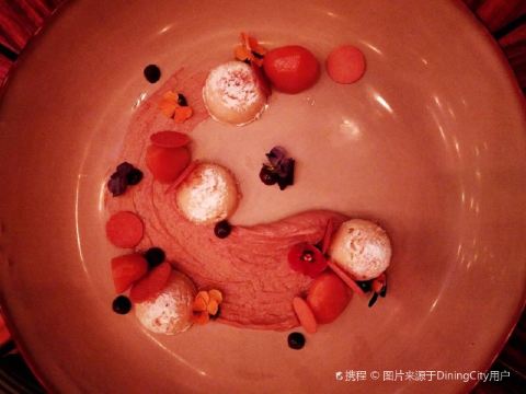 Queeniel服务方面,还是颇有诚意的,有求必应,酒店式服务总是靠谱的。 论口味,真是欲抑先扬。 服务生按照我的口味,推荐了两款佐餐酒,香气还不错,也很顺,适合我这种很业余的口味。 生蚝也算肥美,撒一点柠檬汁或者果醋,完全不腥气。 鳌虾色拉,调味很像羊肉串,虾肉的肉质弹性不足,有点松软。 生菜色拉,这是我第二次吃到成捆的蔬菜,跟我早饭吃的煎饼不要脆饼加生菜有异曲同工。表面包裹的火腿知道有多咸吗?咸菜的浓缩版,确切的说是齁和薅。 主菜里的牛排,烤得挺香,我没有蘸酱,撒了一点盐。肉边上的筋膜靠自己剔除。 帝王硅,目测不嫩,纤维有点粗,吃一口挺腥气的。服务生问我们口味如何,我如实表达,对方给我们换一个主菜,我们选了比较保险的扒鸡。 鸡肉烤得挺香,选的半只,处理也蛮干净。如果鸡肉更嫩一些会更好。 红酒梨,会选这个甜品是因为以前在烤鸭店吃的红酒梨很不错。这里的梨不是浅浅地腌制,而是如同蜜饯一般。谁要来西餐厅吃蜜饯? 巧克力熔岩,终于又迎来了一丝欢愉。 栗子蛋糕,妥妥的结构主义,口味上偏东方风韵。用一个洗手盆一样大的盆子盛装,如果是一个人吃,真的会有猪饲料的即视感。