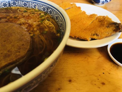 家附近的网红面店,还是第一次去品尝,没有令人失望。 点了蛤蜊猪肝面+鸡毛菜+炸猪排,由于两人只点了一碗面,老板给了四两,面不够可以再加,吃完前服务员询问多次是否要加面;上猪排的同时,服务员还主动给倒了辣酱油,服务很周到; 红汤面,汤很鲜但不咸;面条是细的,煮的很合我口味——不硬也不烂;猪排外脆里嫩,口感很松,可能是饭店里吃到的最好吃的,自己炸的没有它那么松脆;3元的鸡毛菜也比较多…… 小小的店面,性价比很高的本帮浇头面店,值得再去!
