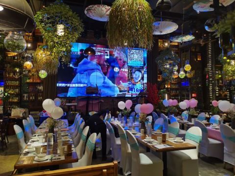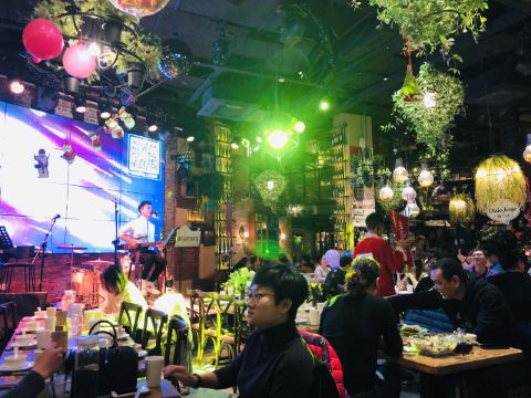 这里的环境很不错,氛围也还可以,菜品一般,不过还过得去,服务也不错,有一些互动游戏,只是乐队和歌手不是一直在唱。