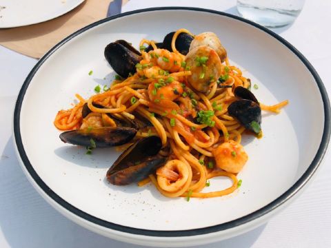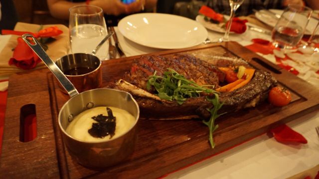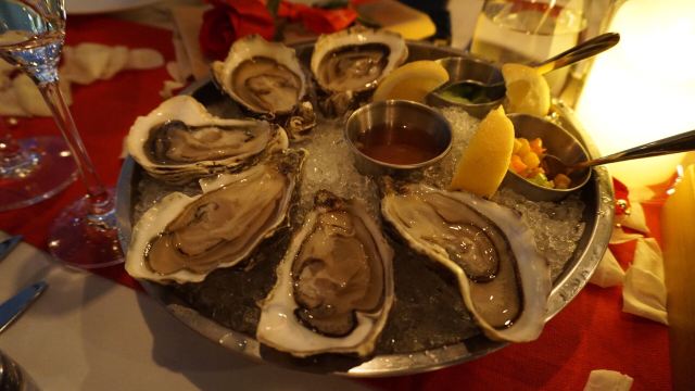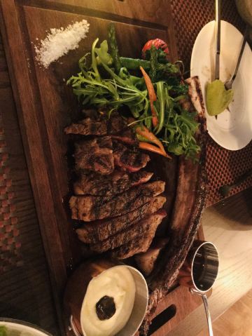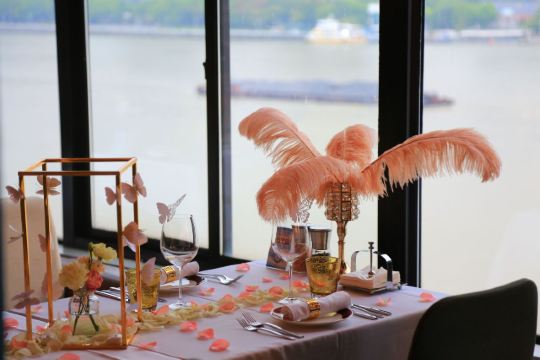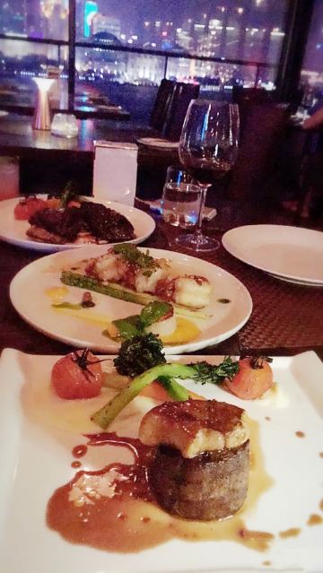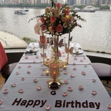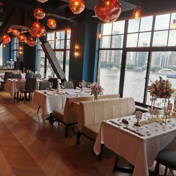 茉粒吖朋友生日预订了这家餐厅,一共8个人用餐,安排了一个靠窗的长桌。 【环境】整体位置很不错,可以看到浦江以及对面的开瓶器三件套,浦江游船来往,繁华好看。 【服务】餐厅为生日会特地布置了玫瑰花瓣和生日快乐的灯牌,很贴心。进到餐厅里有服务员帮忙挂衣服,还会有衣服对应的号牌方便认领。 【口味】点的所有菜口味水准都在线,生蚝新鲜,五分熟的战斧牛排也很惊艳,三文鱼沙拉口味浓郁。最惊艳的是最后的甜品提拉米苏,是服务员推荐点的。作为一个平时对甜品不太感冒的人,也必须承认这份提拉米苏口味很棒,甜度适中,配合一点点咖啡,更加强了不一样的风味。 总体来说,这家餐厅可以强推!