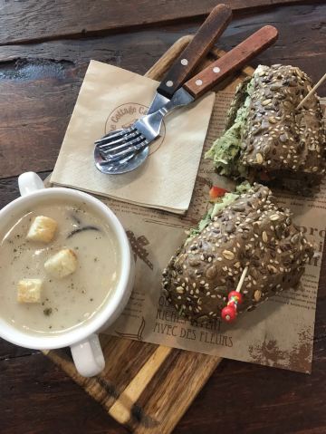 TheCottageBar店面环境很好,布置得超有氛围。老麦咖啡馆名气很响,在武康大楼的楼下,占据了很好的位置。周末午间时分,顾客倒不是很多,原本以为会排队等位呢。来这家店主要为了解决午餐,就没有点咖啡 。点了通心粉和鸡肉三明治配奶油松露菌菇浓汤。浓汤一般,鸡肉三明治端上来前会加热一下,鸡肉还算多,味道还可以。不过面包不太好吃,不像烘烤出来的脆脆的那种,像微波炉加热的那种,咬起来很有韧劲,也费劲。