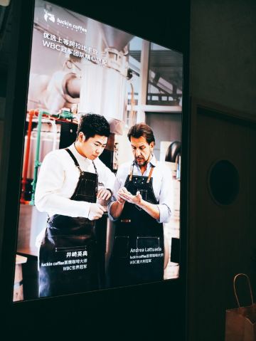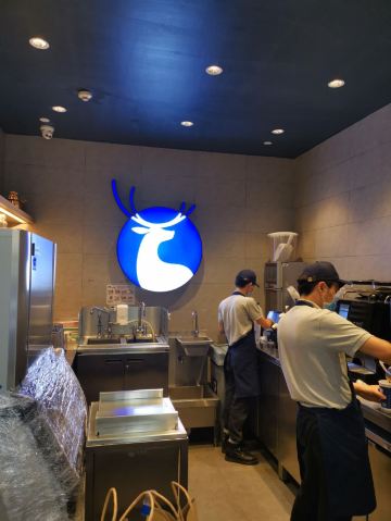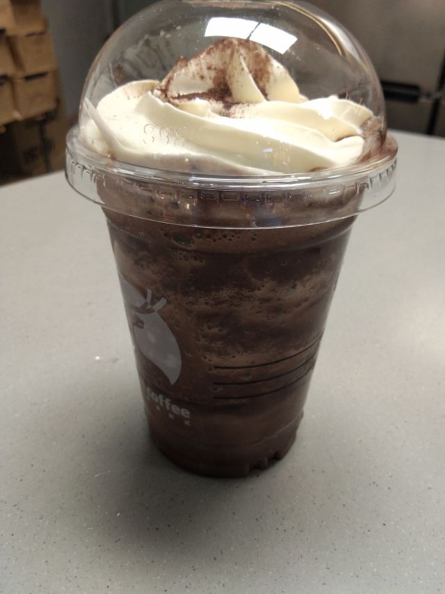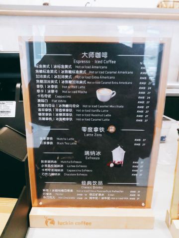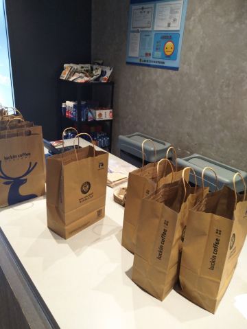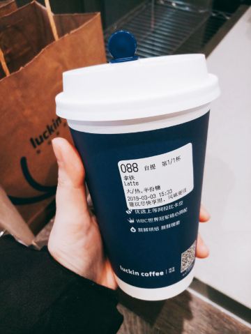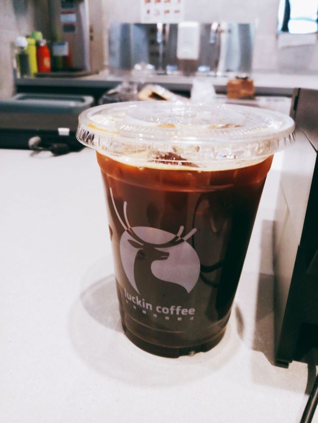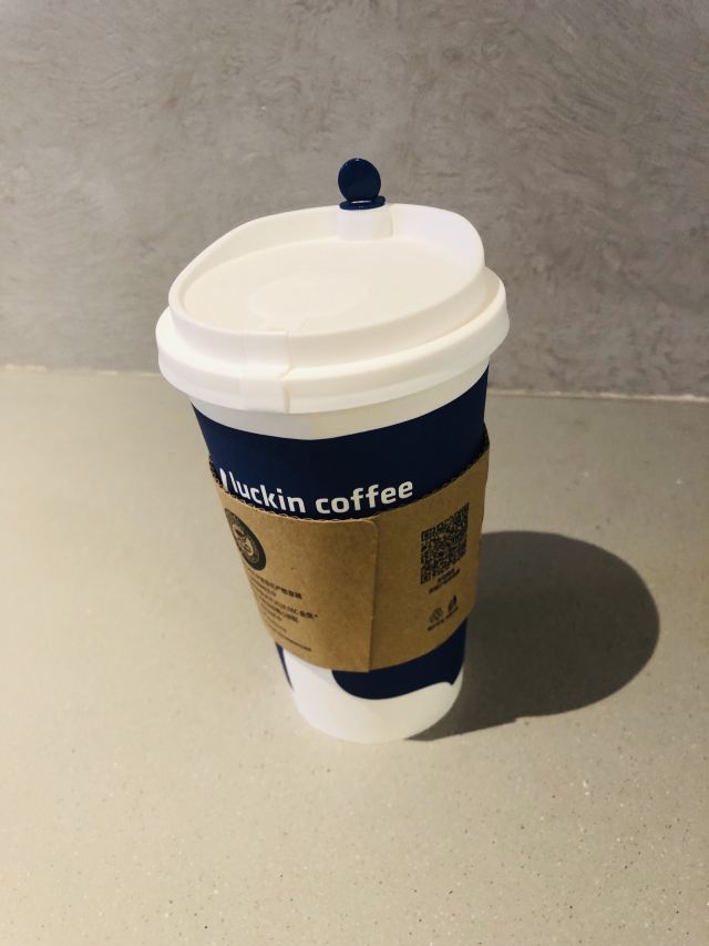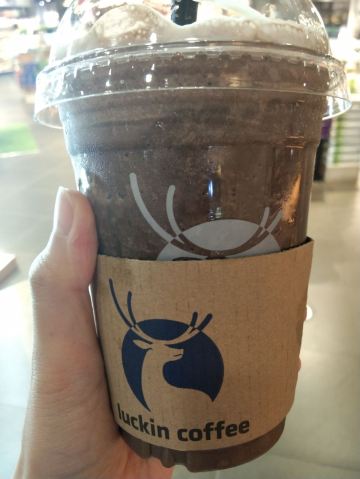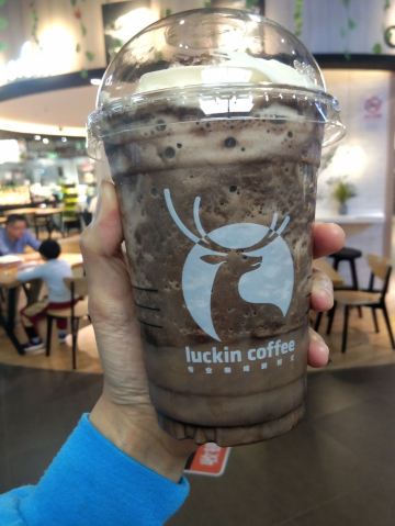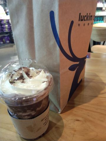 瑞幸咖啡,其实也没有什么服务了,手机下单后店员就做好放在桌上了,自己过去扫码取餐自己套杯套拿吸管,但是便宜啊,原价27元的巧克力瑞纳冰,3.8折后10.3大洋,这比随便哪家奶茶店都便宜了,口感确实还不错,比第一次喝的抹茶味浓多了(不是这家店)又是国产品牌,必须支持一下下。