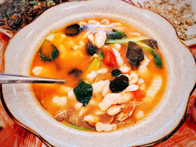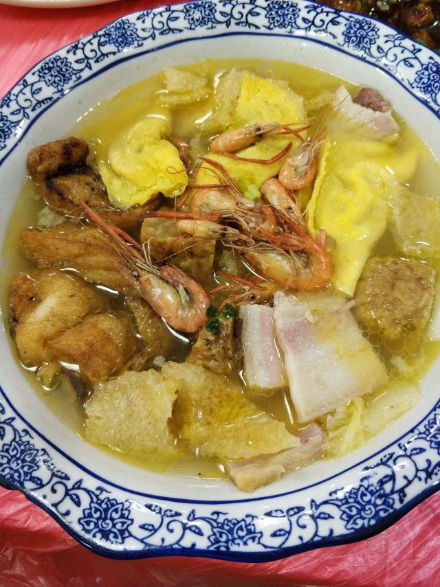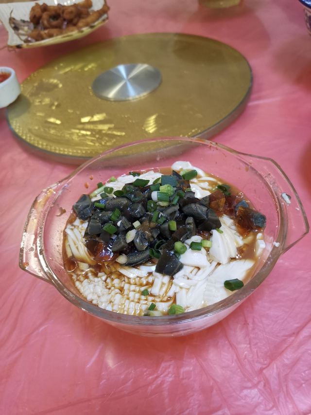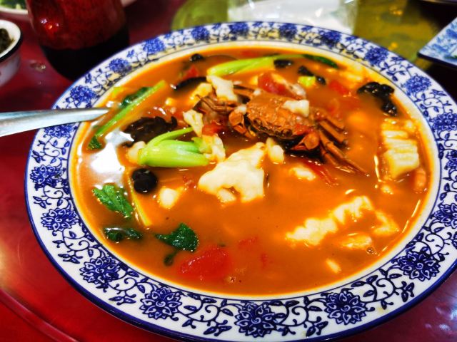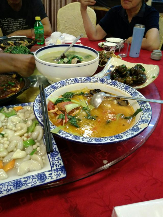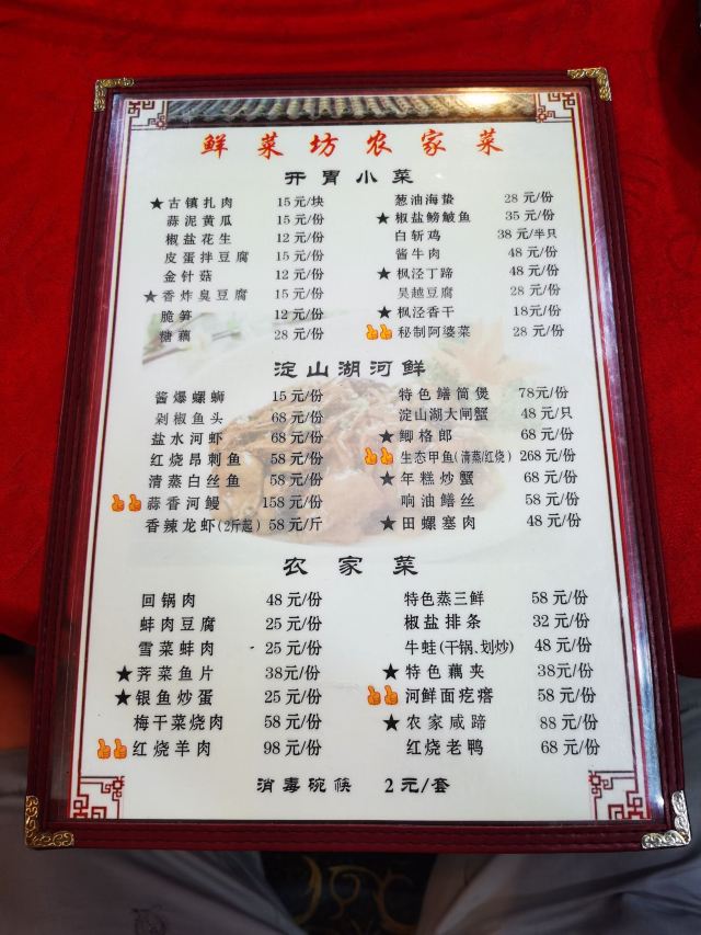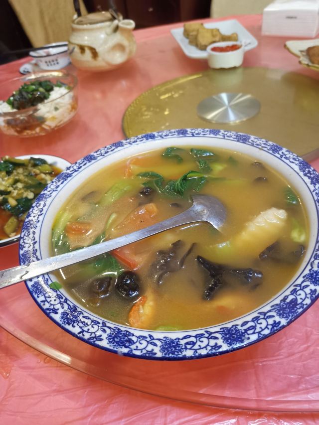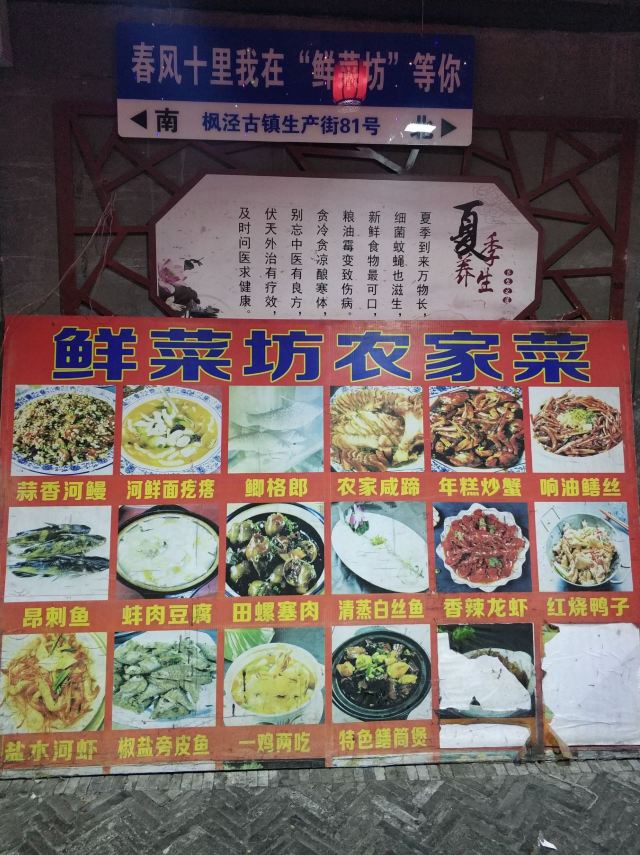 食神牛中了免费试山长水远来到上海的边边头枫泾古镇,提前联系了老板到了出来迎接安排停车。店铺在古镇景区内,沿河岸有露天位,门面不大进门是个小厅都是四人方桌,里面中厅有五张圆桌,后面还有包房,楼上还有小厅和包房,总的规模还可以,装修也蛮简洁清爽。 免费试的套餐有: 蒜香河鳗158元店里的招牌菜,蒜香扑鼻酱汁浓郁,河鳗很新鲜肥美细滑酥嫩。 荠菜鱼片58元鲈鱼片柔嫩鲜滑,荠菜细碎清香。 河鲜面疙瘩58元有螃蟹、河虾、蛤蜊等,番茄汤汁酸鲜浓厚,面疙瘩有点软烂吃口不筋道,建议和面的时候多揉几下。 小米糕22元松软香甜。 时蔬25元蒜泥空心菜,空心菜炒的油香酥透,但是杆子还是有点老。 特色蒸三鲜58元,一开始上来蛋饺没有蒸熟拿下去重新蒸了,也没有给补两个蛋饺。配料倒是蛮丰富的有咸肉、蛋饺、肉皮、肉圆、肉糕、河虾、熏鱼,打底的娃娃菜吸收了油浓鲜美的汤汁非常好吃。 打卡收藏赠送了一瓶酒壶盛装的酸梅汤,冰镇的蛮爽口就是淡了点酸甜味不足。 另点了枫泾著名的特产丁蹄48元一份,蹄髈酥香松化,皮冻鲜咸回甜。 椒盐鳑鲏鱼35元蛮大一份,鱼炸的很酥香松脆,椒盐多了点偏咸。 菱角鸡头米48元菱角脆爽鸡头米酥糯,味道清鲜爽口。 整体菜品比较有农家特色,招牌河鳗烧得不错,其他菜味道一般,菜量倒是蛮大。环境还可以服务很热情但上菜比较随意。