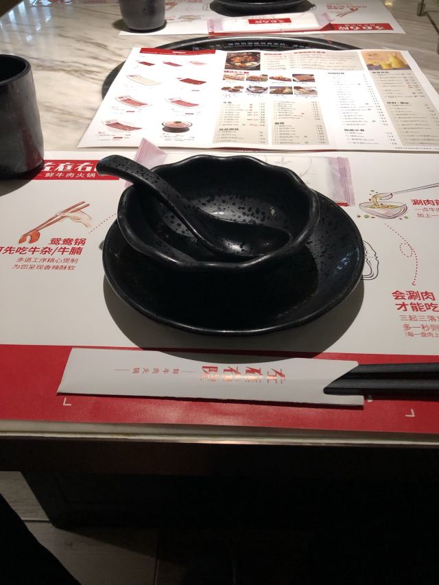 周末中午去的,11:30左右到店,还不用排队,吃完出来的时候外面排队的人就不少了 「牛骨原汤锅」店家会配芹菜末和牛肉末用来搭配汤,汤很香,能吃出来没有任何添加的提鲜的调料,配上芹菜味道更好 「匙皮」肥瘦分布合理,肉质很嫩 「活体豆苗」很新鲜爽口,只是两个人吃量有点多 [服务]很及时,也会热心的帮忙涮肉、加汤、套衣服