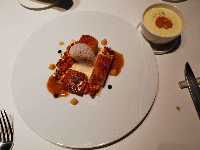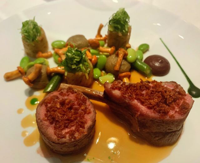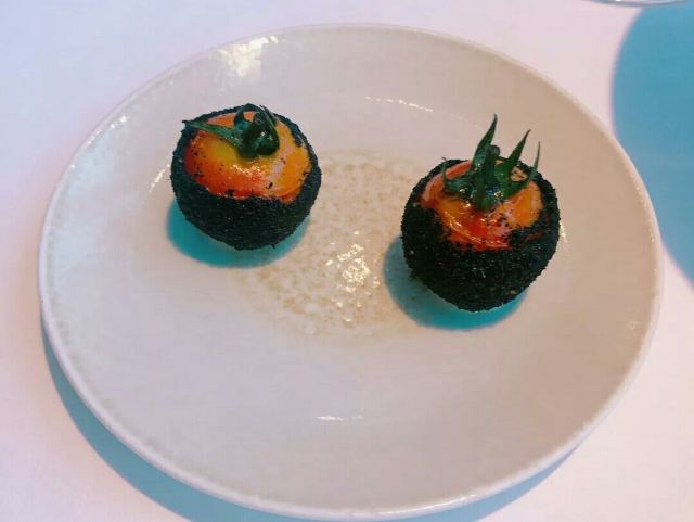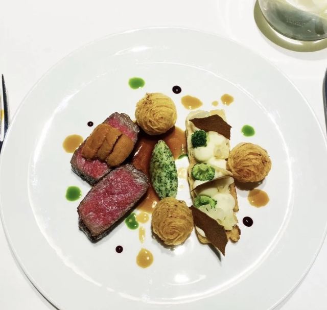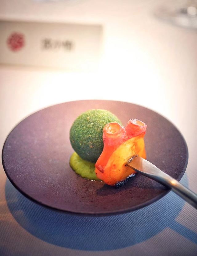 澳洲和牛M7,海鲈鱼,炸蜗牛裹墨鱼汁面包,鸭肝棒棒糖,鳌虾,鹅肝,乳鸽,蜗牛章鱼,鹌鹑蛋红酒酱干葱冷汤,餐前面包,餐后甜品,前菜,巧克力