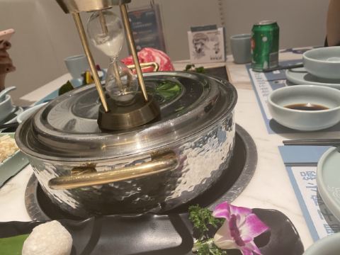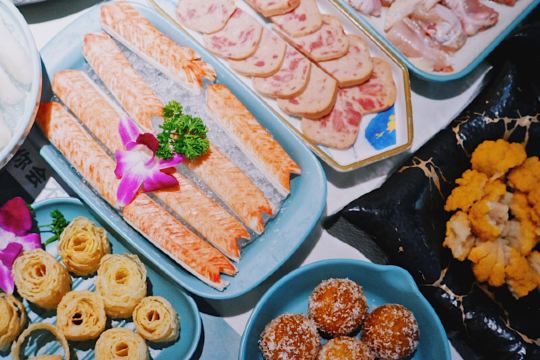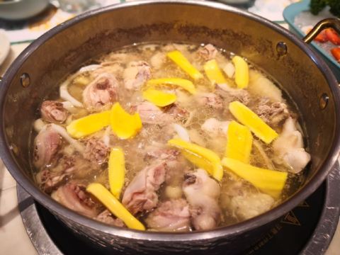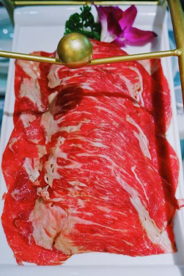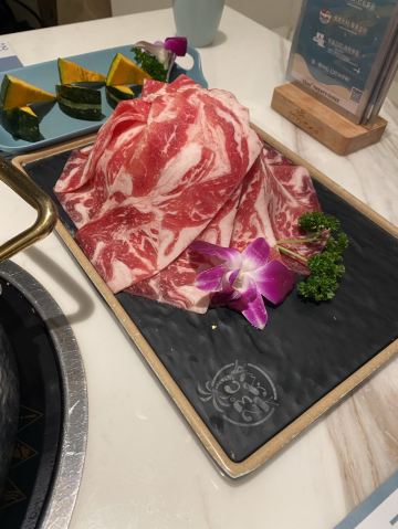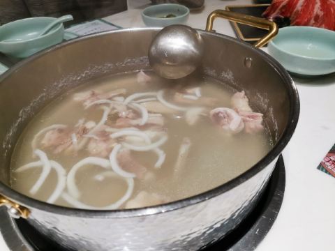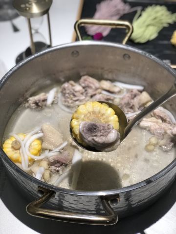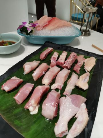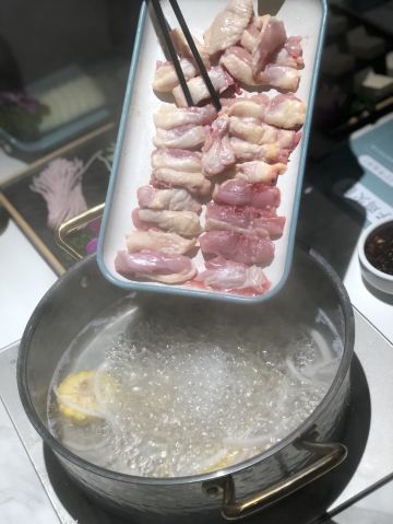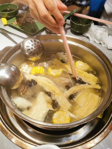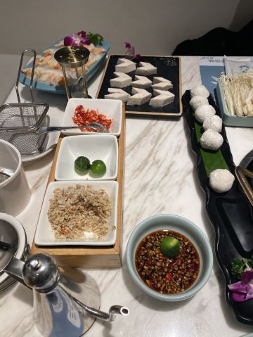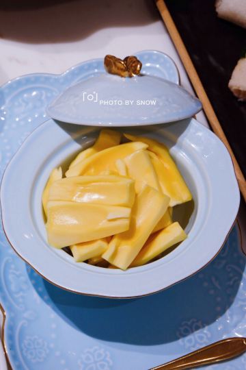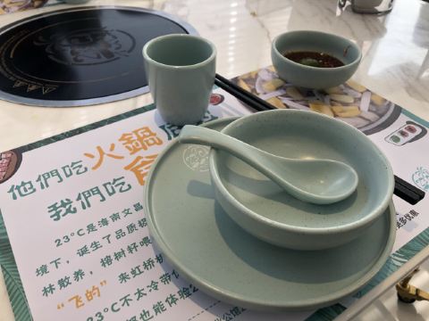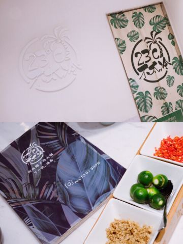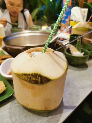 ma****ly种草已久的椰子鸡火锅终于安排上了。 23℃不太冷椰子鸡火锅有着浅蓝色的店标,和白色的洞穴感的餐厅,虽然透过玻璃看到的是窗外的绿植,但却能让我不由自主的以为窗外或许是一片海岸。 锅底是纯椰子汁,原锅里有两个椰子汁,当店员打开锅盖的时候,会倒入第三颗椰子汁,还有一大盆的珍珠马蹄。 鸡是当天从海南空运过来的文昌鸡,倒入锅底之后,会有店员适时得推来装着菠萝蜜的小车,现场帮客人拨出一盆菠萝蜜。 这菠萝蜜,可以直接吃掉,也可以丢进锅里一起煮。煮过的菠萝蜜,要比直接吃起来更甜,这汤底,自然也更加清甜了。 涮好的鸡肉,皮脆肉嫩,蘸着店员调制的酱料,走的是清爽的味道。 宫廷肉类拼盘,澳洲雪花牛肉,牛舌和猪肉的组合,牛肉嫩,牛舌脆,可是还是猪肉最好吃。 兰花蚌,不推荐,有些嚼不动。 海南椰子饭,很好吃,糯米弹牙不粘腻,还有着椰汁的清甜味道。 广式腊味煲仔饭,香甜浓郁,也是一道很不错的主食。