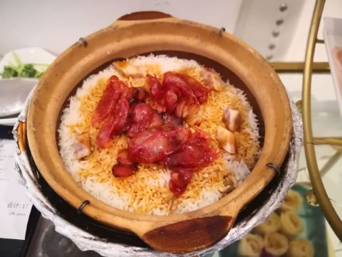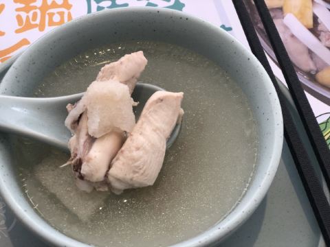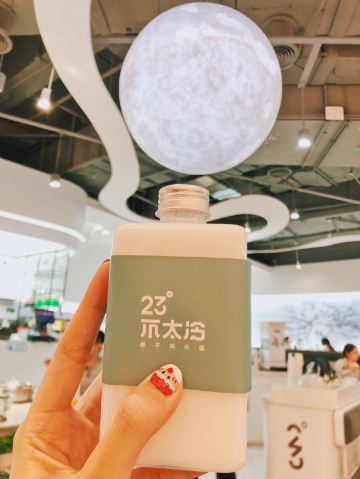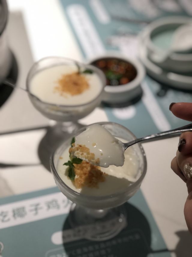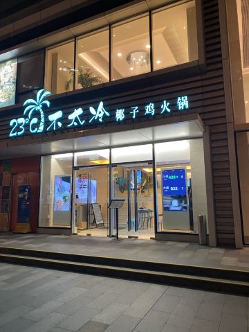 23 Du bu tai leng ye zi Chicken (jing an qi jian dian)冷色调的原味椰子鸡火锅,魔都超人打卡地 说到椰子鸡火锅,不得不提23度不太冷,餐厅中央的巨大的带象征着的莫比乌斯环,怪不得王思聪等明星一年要来好几次,23度是海南平均气温的代表,象征着人体最舒服的问题,在如此环境下的鸡肉椰汁汤,也是好吃得不行。 原味椰子鸡锅,用三颗椰汁为底,汤头清甜好喝,新鲜看得见呢。还有椰肉可以食用,选自海南文昌鸡肉,久煮不老,蘸取店里的独家秘制酱料,实在是太美妙了。 荔浦芋头作为涮菜,也是粉糯无比越煮越好吃。 广式腊味煲仔饭,略带焦香的香肠和米饭一起,底部锅巴焦香诱人,腊肠口感很棒。 最后的网红椰子冻也是特色,清甜可人,椰肉嫩滑,简直是完美地收尾。