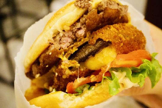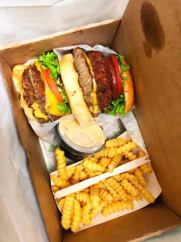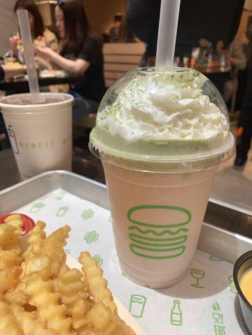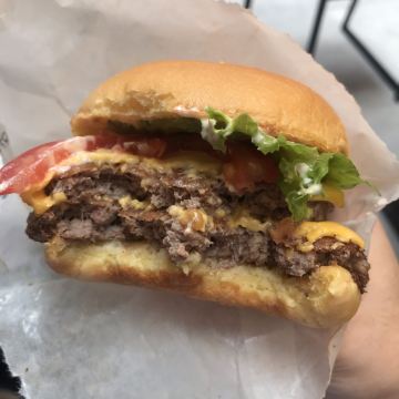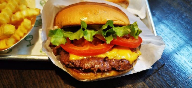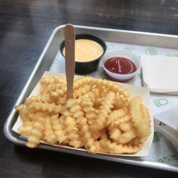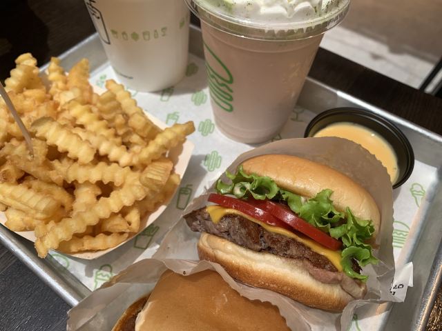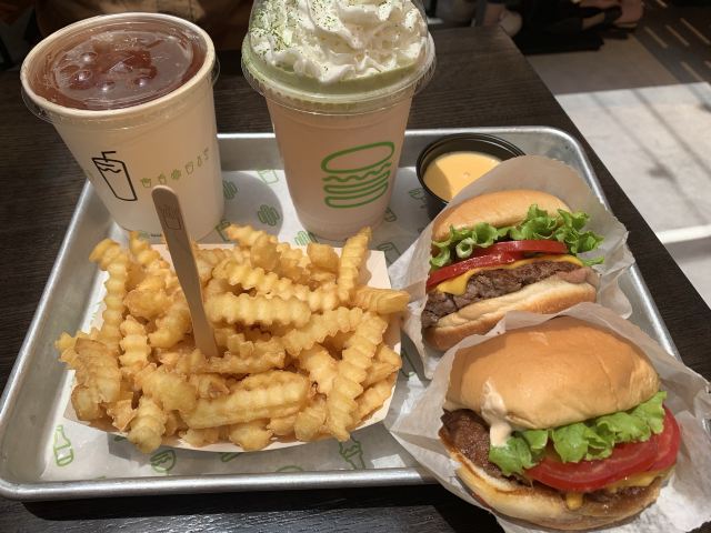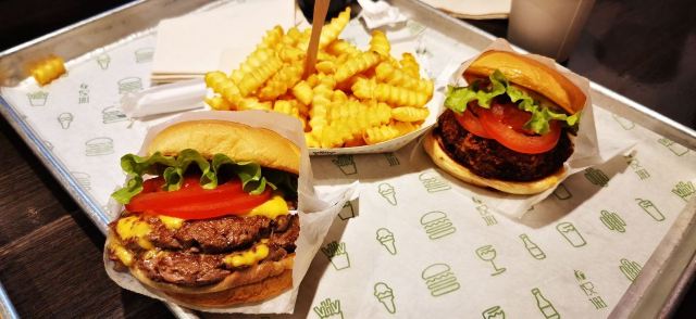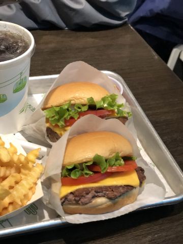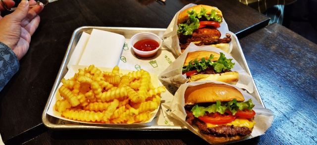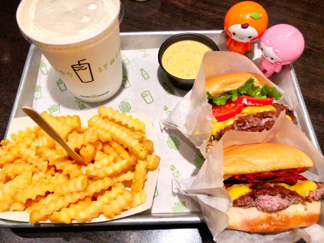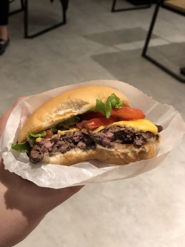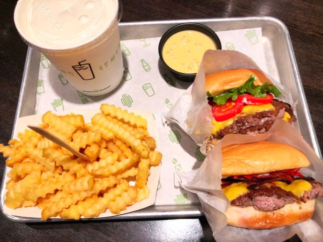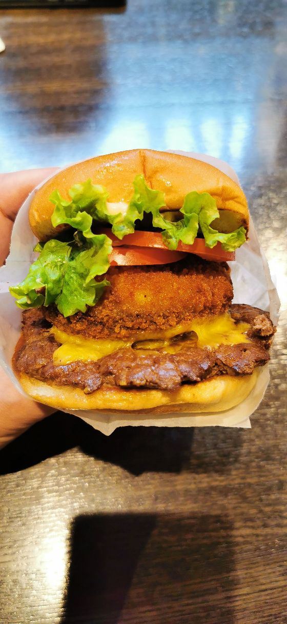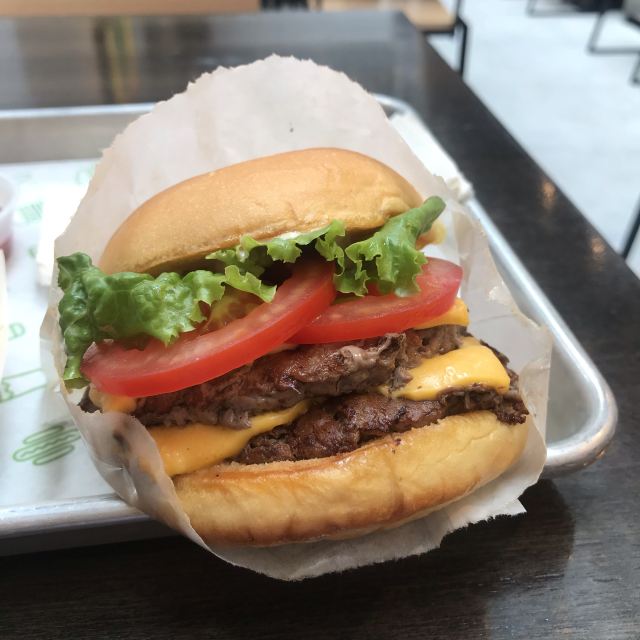 Shake Shack几年前的网红汉堡店,当时看了看朋友圈都排了绕了新天地几个圈了,这次来参观一大会址,想着就要来拔草一下。 地址就在一大会址旁边,真是超级的近。参观的预约时间没有到,索性就直接来先把午饭解决了。 「双层牛肉汉堡」 本来以为双层牛肉汉堡🍔会很大,上来的时候尺寸还是觉得有点mini。他们家的汉堡最让我感觉好吃的就是2块牛肉饼,拿在手上的时候整个手都油光光。牛肉饼汁水超级的多。 「芝士薯条」我脑子里一直想着芝士肉酱薯条🍟,上来的时候想肉酱呢[捂脸][捂脸][捂脸]薯条热的时候还蛮好吃的,不过感觉还是番茄酱更配一些,芝士吃多了反而有点腻。最后和朋友3个人一起把薯条给消灭了。 听说奶昔,啤酒🍻也是他们家特色,想想一顿一个人吃了100多太奢侈,下次再换其他的吃吃。