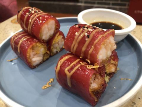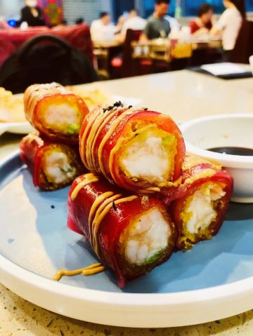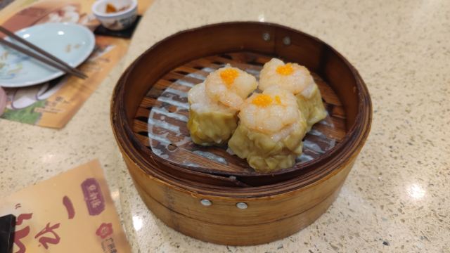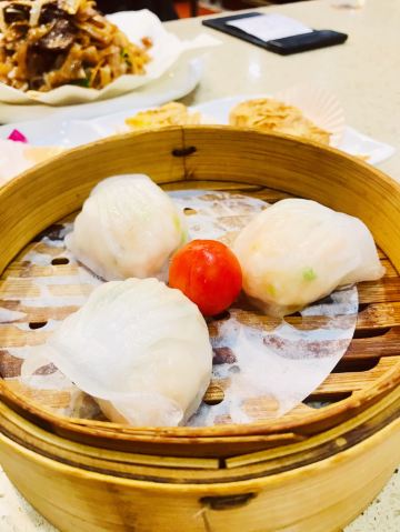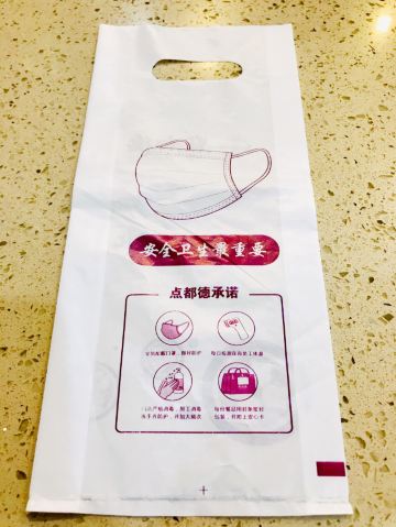 Monimika☘️心心念念的点都德,终于吃到了。 ☘️「金莎海虾红米肠」:点评上看到这个是推荐菜,于是果断下了单。外层的红米肠有点像雪媚娘的口感,里面的虾肉和虾饺皇一模一样,好吃。 ☘️「西杏片炸鲜奶」:杏仁片很香脆,炸鲜奶外脆里嫩,味道不错。 ☘️「叉烧酥」:叉烧酥面粉裹得有点多,叉烧比较少,偏甜,感觉一般。 ☘️「干炒牛河」:意料之中的美味,绝对管饱。 ☘️「真係菠萝包」:说实话,有点失望,菠萝包的皮怎么会这么厚、这么干,完全不像港式茶餐厅的菠萝包,不太喜欢。 ☘️「金牌虾饺皇」:超级好吃,虾肉里面还混了芹菜,鲜美无比。 ☘️「香芋西米露」:非常奇怪的口味,喝了一半就放弃了。 ☘️店家贴心的准备了口罩收纳袋,细节到位。