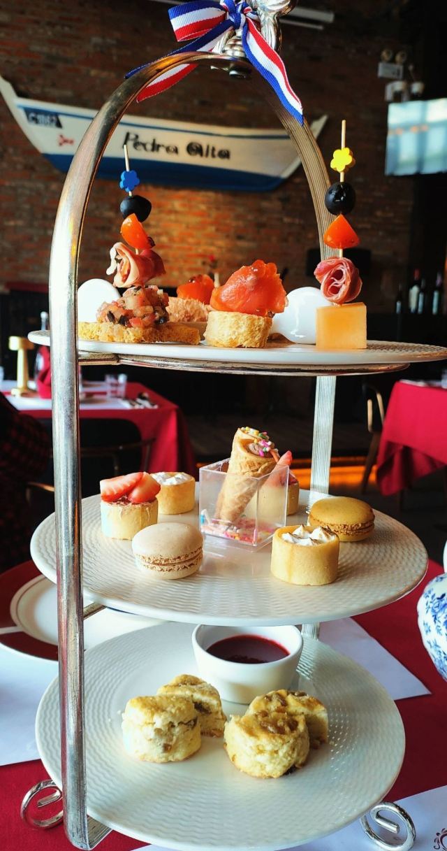 Pedra Alta餐厅坐落于船厂1862时尚艺术中心,环境舒雅,一旁有放置红酒瓶的柜子,餐厅渗透着海洋风的元素,挺有格调,餐厅的空间挺宽敞,就像一个大的酒吧西餐厅,无打扰式服务。透过大玻璃窗可以欣赏滨江的风景,可以看到黄浦江上船只来往穿梭、对岸北外滩的一幢幢楼宇,景观无限好。 餐厅主打法式料理的西餐,我们这次去拔草的是双人下午茶,甜点和咸点皆有之,是放在三层鸟笼架子上的,还选了饮品英式红茶一壶。茶器表面是英式的花纹,造型很原汁原味。英式红茶入口很温和,没有过多的刺激胃,温度适宜,还带着一股特有的清香,和甜点咸点搭配起来再合适不过了,茶水量多。甜点咸点口感都很正宗,造型都很小巧精致。咸点中最喜欢自制烟熏三文鱼卷配三文鱼籽,很大的三文鱼卷和三文鱼籽,风味很好。甜点中芝士蛋糕、歌剧院蛋糕还有法式马卡龙风味挺好的。芝士蛋糕口感超级浓郁,底下的手指饼干很脆很美味。歌剧院蛋糕里的巧克力味和奶香味都很浓郁。法式马卡龙的造型很好看,粉嫩的和白色的各一,制作很特别,里面有蛋糕还有浓郁花生酱,口感好棒,给我满满的惊喜。