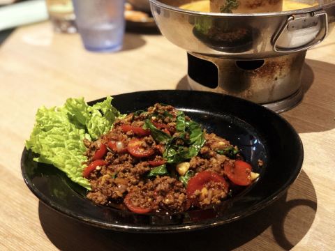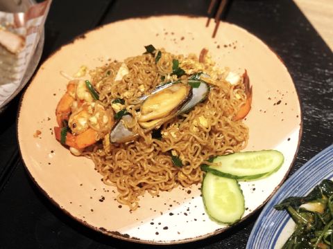 吃泰国料理必点菜就是gapao 这家店的gapao居然有小番茄,惊呆了 但是味道还可以! 「冬阴功海鲜汤」的小辣椒皮有点多 「马来咖喱牛腩」牛腩还是好吃的 「萌萌哒海鲜面」炒方便面加点海鲜 「碳烤猪颈肉」不油!猪颈肉必须不油! 加上我们笑笑周带的白葡萄酒! 幸福加倍!