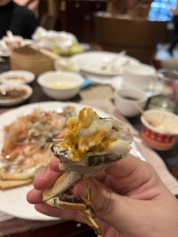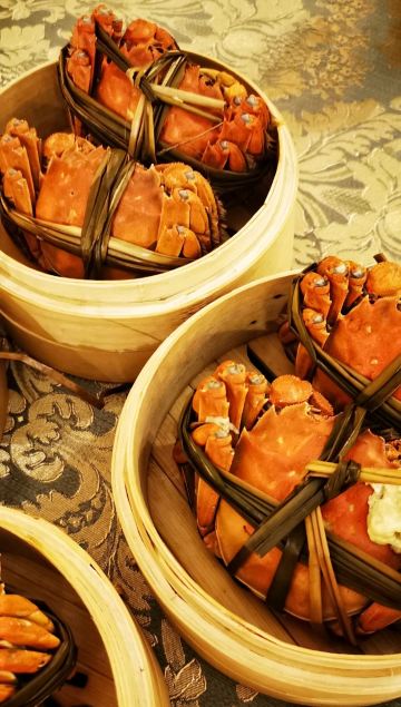 吾是土豆泥每年10月到1月王宝和的大闸蟹都是非常的吃香,这次终于拔草了王宝和大闸蟹自助餐,提前了一个多月预订,已经没有周末场了,约了周五晚上的这场。提前在公众号买了券,小朋友高于1米,现场另收188。 [薄荷]环境: 5点30开始进场,餐厅就在酒店的1楼高挑的大堂。按照预订信息提前入座,吃饭过程中会来验证团购券。 「大闸蟹」雌的可以一次拿2只,雄的一次只能拿一只。1月的大闸蟹不论是黄还是膏都非常的饱满。吃到后面还是雄的好吃😋,满口的蟹膏🦀️。 「醉蟹」用的都是雌蟹,每只都非常的壮,绍兴黄酒非常入味,分量充足,满口的咸鲜味。 「小馄饨」「小笼包」小笼包是6点以后现蒸的,每笼2个,热的非常好吃,里面的蟹粉可以看得到。小馄饨每碗6,7个,浅尝一下不错。 「哈根达斯」6种口味,量力而行,比较喜欢奥利奥口味的。 姜茶特别赞,绝对是吃蟹的利器。小朋友这次给力,吃了好多蟹膏和蟹腿,我帮她剪腿,她自己拿工具挑。 家里两位老人不舍得来,我觉得蛮好的,比吃300一碗蟹粉面要值,明年再来。