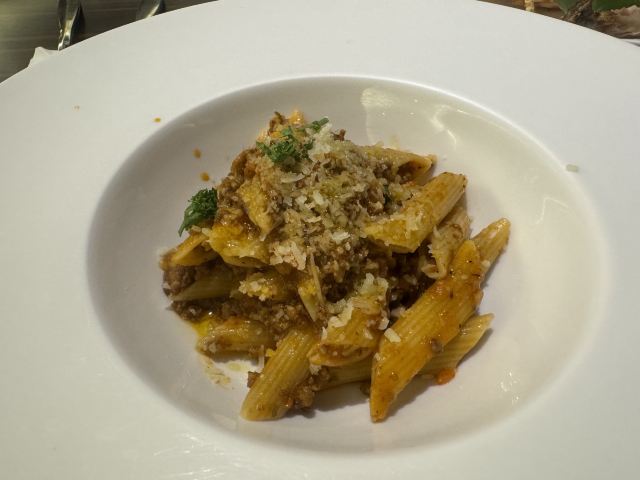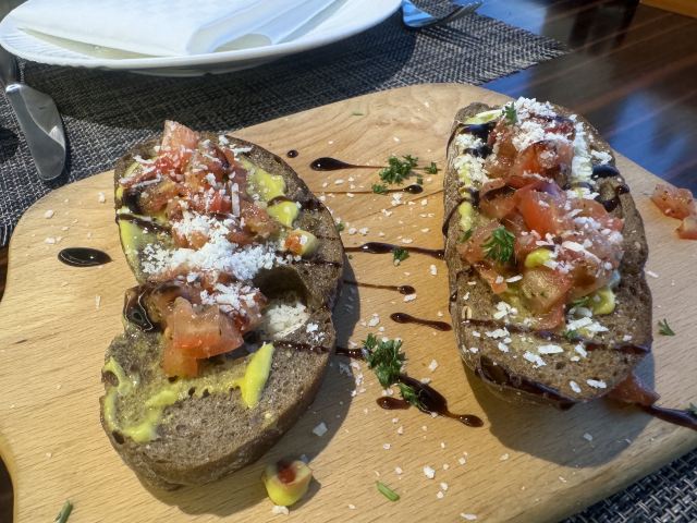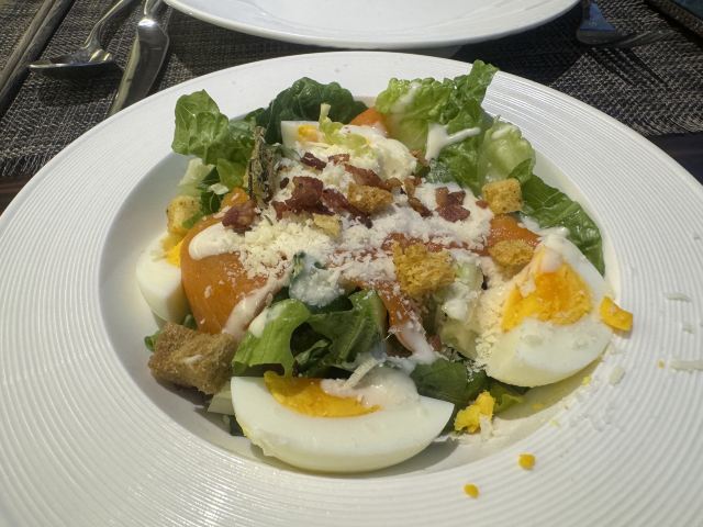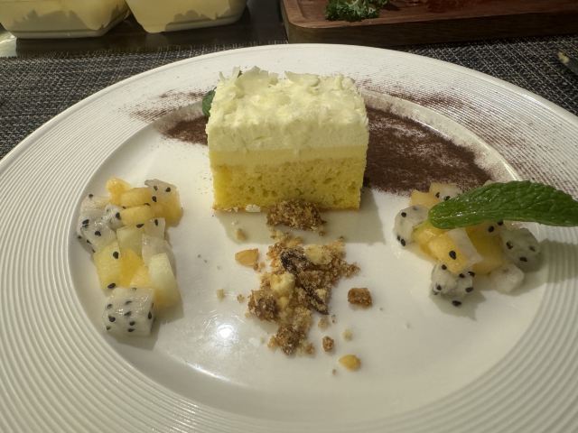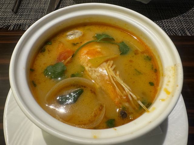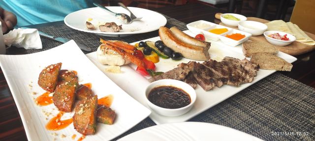 食神牛店家宣传的是39层高空景观浪漫餐厅,店堂分了两边,装修欧式复古有些老旧,靠窗的位置不多,东方路这边俯瞰周边环境都是平房没啥风景,陆家嘴三件套只能远望看到两件零个尖,开车可以停在1楼地面停车场免费4小时,但车位有台阶低底盘车慎停。 接待蛮热情安排座位倒上热水,到得早可以自由选择,被告知6点才能准时开餐。开餐前会验证券码确认套餐,服务员大声统计各套餐数量给人一种食堂的感觉。态度虽蛮好服务却不够规范,每次撤盘都要叫,上菜的节奏也把握的不是很好。其中一名服务员的工作服还脏兮兮的。 前菜: 意式烤面包,面包片上放了番茄丁、果粒,佐芥末酱、油醋汁,味道蛮爽口但面包不热。 凯撒沙拉: 烟熏三文鱼、生菜、培根、面包粒、鸡蛋,佐帕尔马芝士和色拉酱。 汤品: 居然是冬阴功汤也是蛮奇葩的,汤里有大头虾、墨鱼花、淡菜、章鱼须、番茄、菌菇,味道酸鲜不算浓重,辣的有点上头。 主菜: 很大一盘有炭烤澳大利亚肉眼牛排,牛排烤的比较老而且部分油肥筋韧吃起来费劲。 香煎法式羊排,厚切略带肥油,鲜咸酥香松嫩。 墨鱼烤肠香咸味浓紧实有嚼劲。 配蔬菜有彩椒、玉米、樱桃番茄、烤小土豆、大蒜,佐黑胡椒汁。 芝士焗龙虾,芝士蛮厚但虾不新鲜,虾肉酥噗噗的还有点粘壳。 大蒜黄油烤扇贝新鲜度也不高蒜香油浓。 主食:意大利肉酱面,用的是空心面比较软糯,肉酱细酥调味还不错。 甜点:芝士蛋糕蛮好吃的奶香鲜甜、松软细柔,配了水果粒、布糠。 套餐里有一瓶红酒原产地南非。 大多数菜品味道一般,食材品质不行,特别是海鲜不新鲜。据说泰国大厨主理所以西餐有点不伦不类,刀叉外还配了筷子。