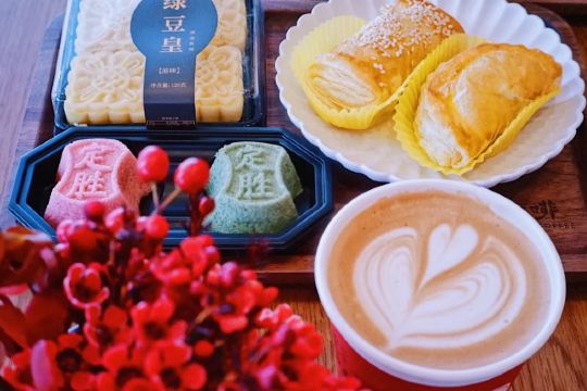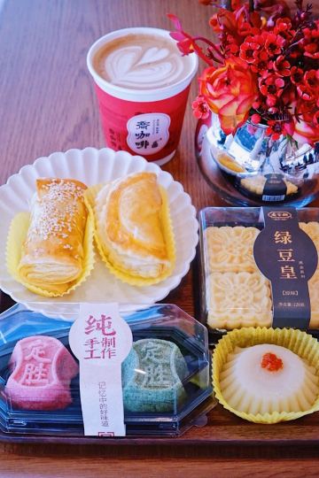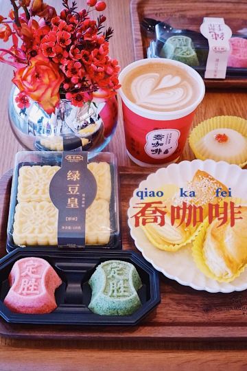 现烤鲜肉月饼,乔咖啡,点心,糯米三丁烧卖,拿铁咖啡,蟹壳黄,叉烧酥,绿豆糕,乔家栅绿豆皇什锦礼盒,奶咖,老上海特产定胜糕装