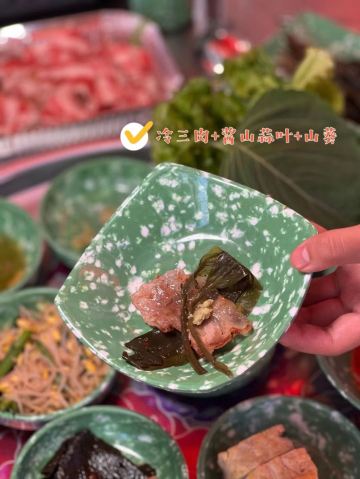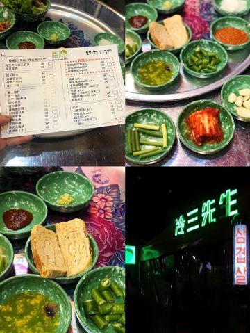 冷三肉,海鲜葱饼,牛五花肉,辣炒鸡爪,冷三炒饭,芝士玉米,一桌小菜,牛五花,牛肉大酱汤,牛肠拼盘,拌海螺辣面,苏子叶炒年糕汤,鱼饼串,拌海螺拉面,米雪酒