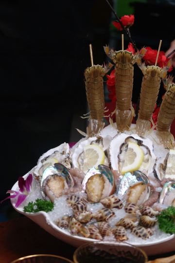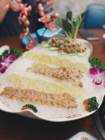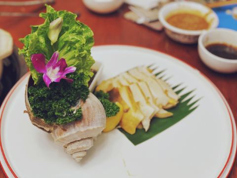 上班的时候在主页刷到这家,看环境真心一般,但是考虑它是开了十几年的老店,居然评分这么高,一定有道理,于是过来探下究竟~ 帝王蟹一只,才497.5元!比我在济州岛吃的还要划算,可能是因为比较小,4个人一只足够~6人也够,再吃点别的也正好~关键是肉都是鲜甜的~~应该是活的![馋][馋][馋] 椒盐牛蛙刚上来觉得有点红,就问了下,原来是放了腐乳的缘故,怪不得味道有一丝丝甜~符合上海口味~ 鲍鱼不小,半个手指大小,都活的,逗逗它们,他们就吸在一起了。 烤响锣也挺赞的,用茅台酒浇在了海螺上,大火窜得好高[色] 雪花牛肉的肉片花纹好看捏~煮熟之后,纯瘦了~ 如果来这里准备吃海鲜,那就选清汤锅底38元比较实惠;如果喜欢喝汤,可以选择花胶锅底哦~