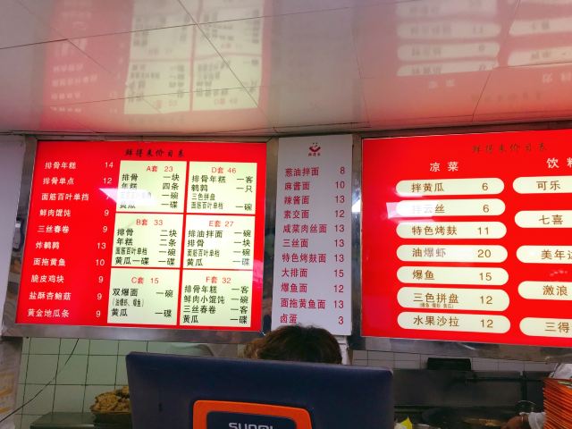 年糕,炸猪排,葱油拌面,排骨单点,鲜肉馄饨,面筋百叶单档,炸鹌鹑,双档汤,盒双档,拌黄瓜,油爆虾,特色烤麸面,四喜烤麸,糟毛豆,三色拼盘,三丝浇头,咸菜肉丝浇头,素交浇头,盐酥杏鲍菇,脆皮鸡块