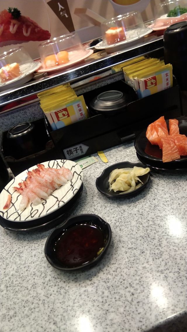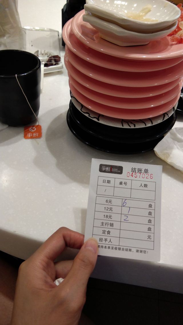 争鲜回转寿司从起初没几家到现在随地都是,小店简单而安静,每个座位上都有茶杯和热水龙头,桌子上有袋泡茶,这样的格局与其它寿司店都很相像。料理台总是很干净,旋转带上食物满满的,可以一直拿,一直拿,一种满满幸福的感觉。寿司种类较多,刺身也蛮新鲜的。均一价格六元,非常实惠啊。