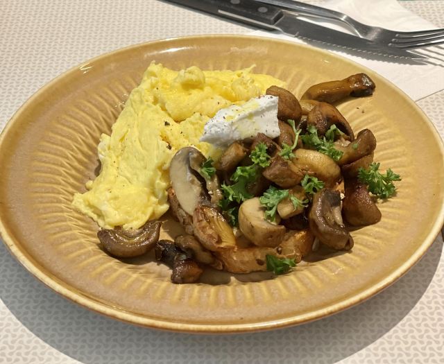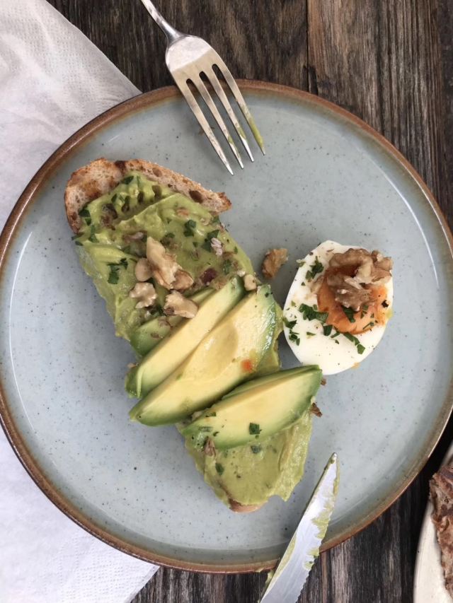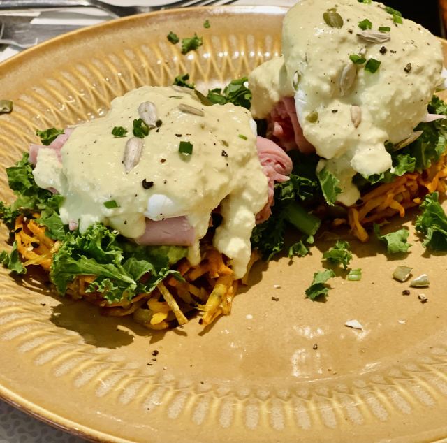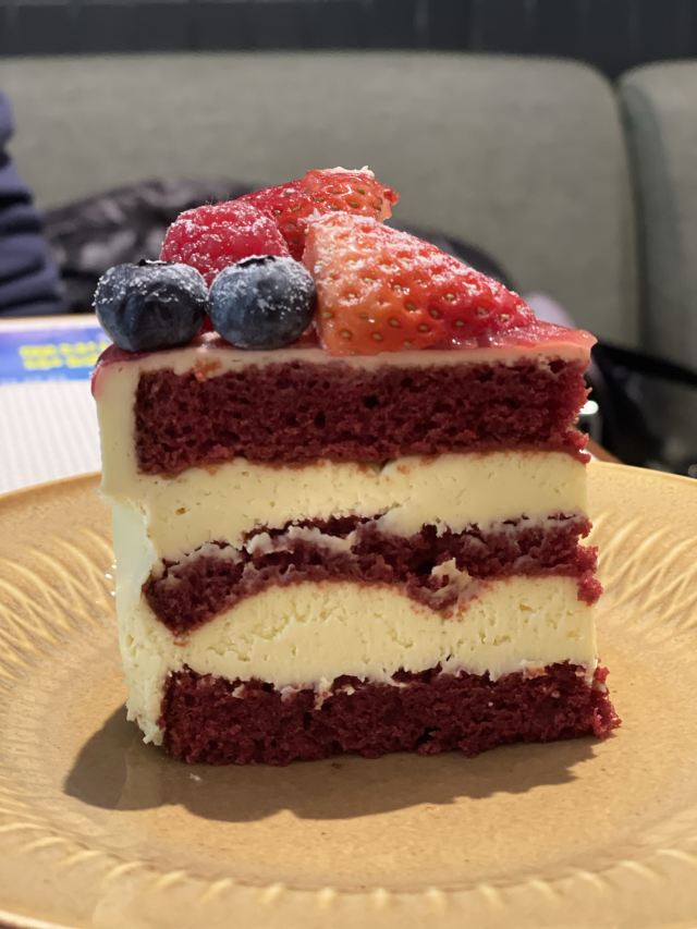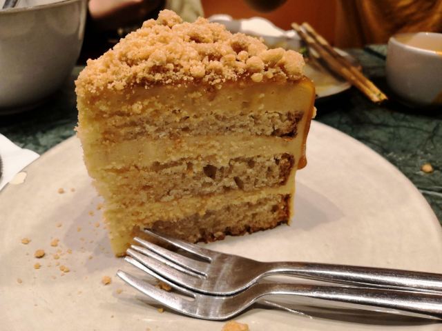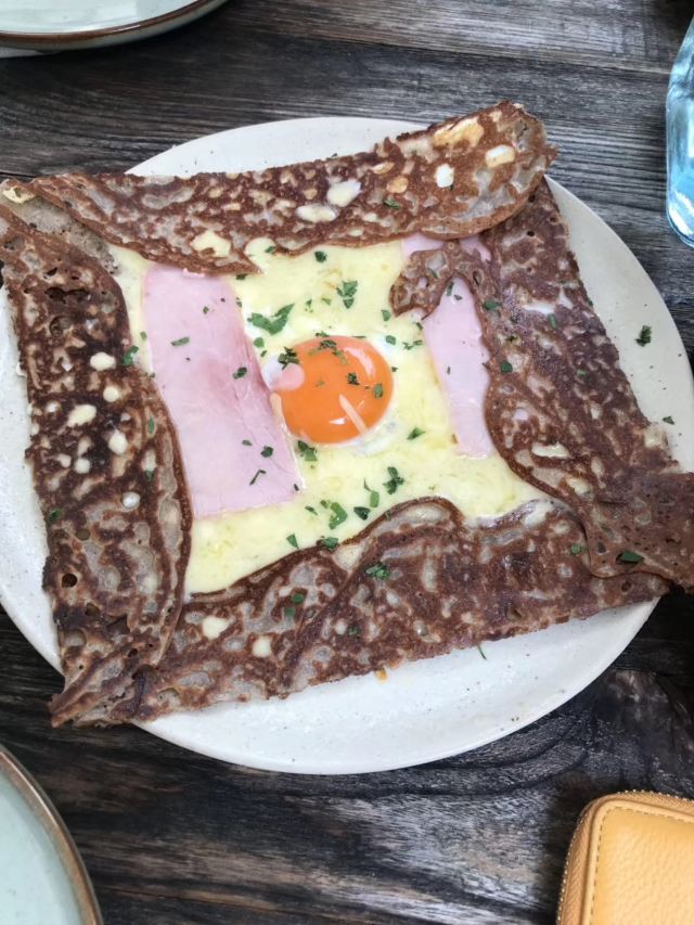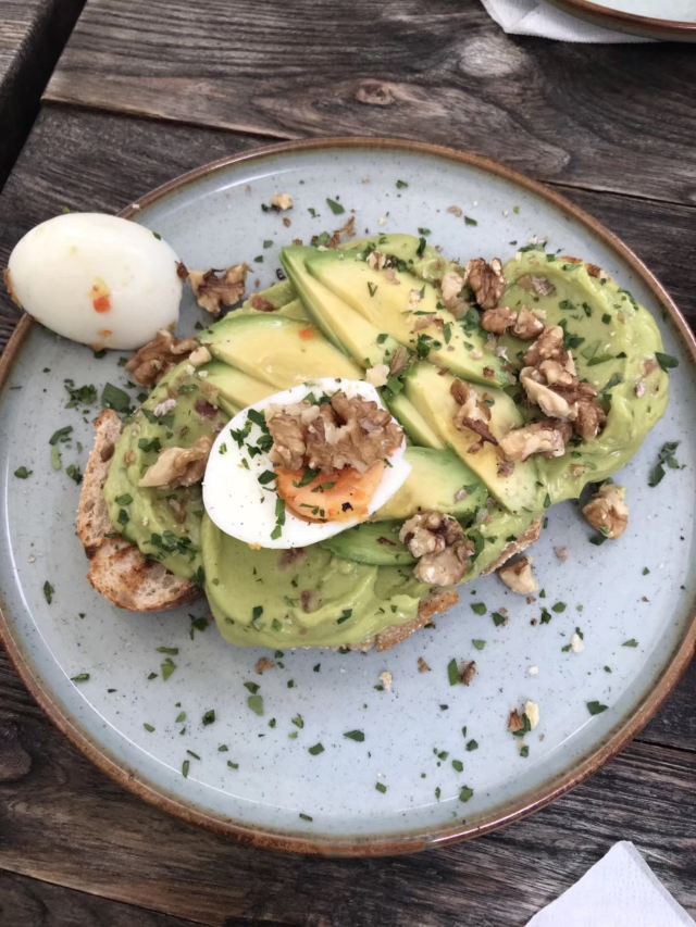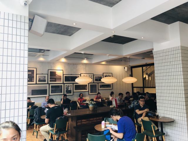冰蓝0911杏仁羊角,口感偏干脆,上层满满的杏仁越嚼越香,不愧是TOP1. 可颂面包,外层酥脆内层松软,烤得恰到好处,浓浓的黄油香. 炒鸡蛋蘑菇芝士塔丁,蘑菇煎的干香搭配芝士法式吐司,口感丰富.好吃. 早午餐点了火腿水波蛋红薯土豆饼,水波蛋裹上一层蛋黄酱,搭配咸香的火腿刚刚好,土豆饼也有其他蔬菜一起炸.另外还有水波蛋芝心法式吐司,吐司内有一层像烤过的奶油,浓浓的奶香,分量跟用量上还是比较足的. 红丝绒蛋糕,口感扎实的蛋糕体,搭配酸奶油,很是对味. 拿铁咖啡,属于偏咖啡香味浓郁&淡淡的奶香那种.好喝给个赞! 环境跟安福路上的几间比较还是属于比较大的,就是周末过11点就满座了,会有点吵.