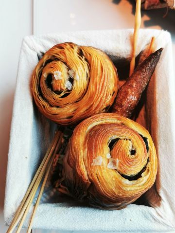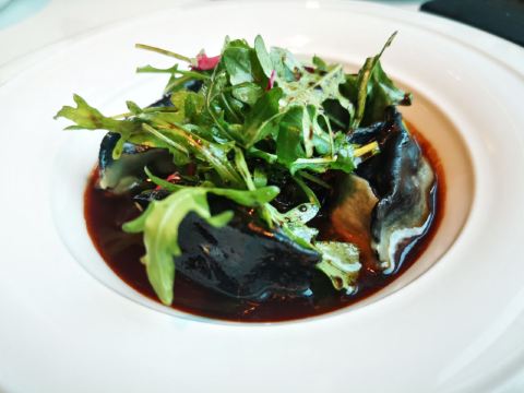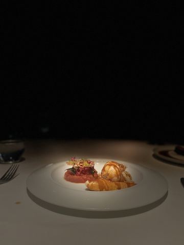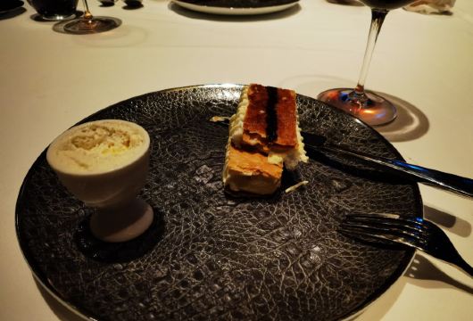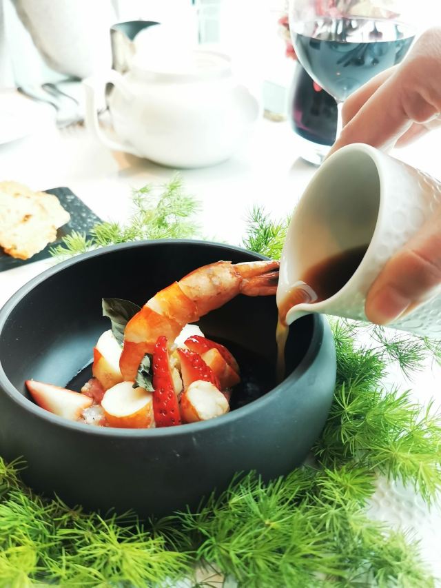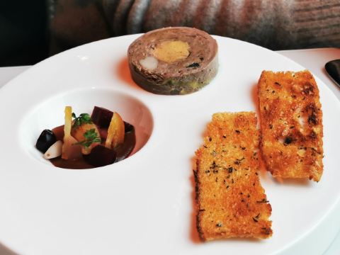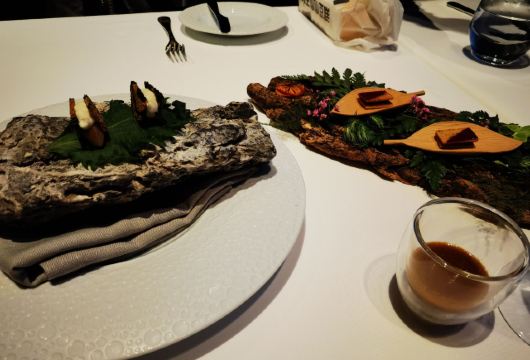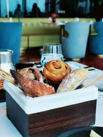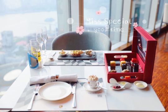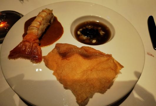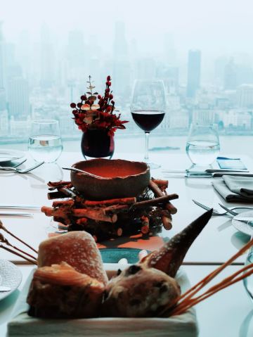 爱冬阴功的小老鼠羊毛套餐~为店家贡献了4个set~~~ 很少会觉得餐前🍞 有吸引我的,他家是一家,特别是酥皮松露卷,酥皮太美好了哇😍😍😍黄油有三种味道,盲品粉色那块失败,原来是甜菜来的,绿色的罗勒味清香的。 鹰嘴豆泥清淡,搭配好吃的🍞不知不觉也吃的差不多了。 虎虾三吃:摆盘霸气,虾头虾油略腥气的味道是我所喜欢的,🍓很甜。 鸭肝:一般,鸭肝没有特别细腻,且餐前面包太优秀,鸭肝作为搭配🍞的另一种option多余。 意式饺子:对🇮🇹 饺子还停留在泰安门超赞的牛肉芝士饺子的期待上,这家讨喜在浓郁的红烩风味,比双立人的雷人出品高明不少。底部的牛尾肉略咸。 油封三文鱼:对期待的波特酱汁期待略高,其实偏清淡,三文鱼肉质可以的。 慢煮柑橘:有意思的甜品微微酸微微苦,适合解腻。 巧克力榛子:不会特别甜,巧克力有那种愚园路80块两口没了的巧克力甜品的好吃的味道。 欢迎红酒,智利赤霞珠,酒体轻盈,就是红酒和海鲜为主的set不是很搭,如果换成白的更佳。 最棒的是这么好的view还能几乎包场,服务员收拾桌子勤快,这家可要撑下去啊。。。