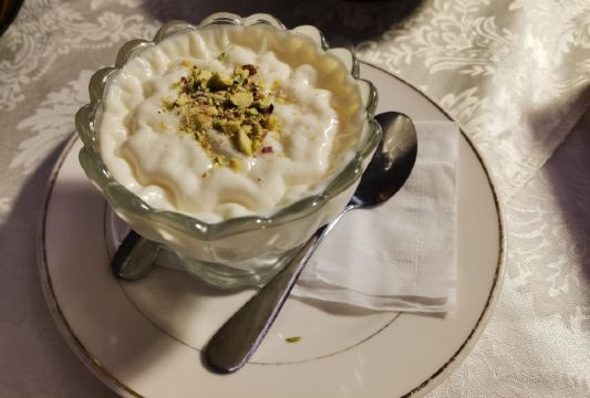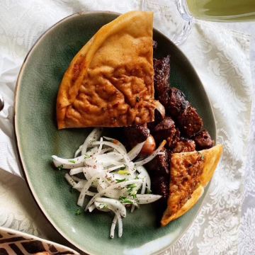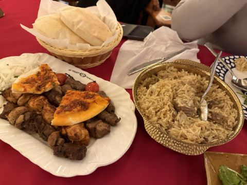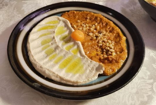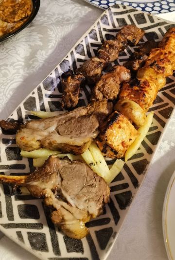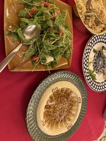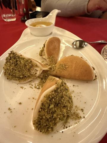 我一直觉得正不正宗跟好不好吃是两回事 很多时候 我们去体验一家异域文化的餐饮店 就是要去感受一下当地的那种氛围 当然 这家店 从口感上来说 我个人觉得做的挺正宗的 只第一口 就瞬间拉回到那些个没啥好吃的国度里 讲真 在哪里游玩的日子里 就是这个味道 |鹰嘴豆泥^是我还比较能接受的一道菜 偶尔吃起来还不错是吧 天天吃你试试看 |法式羊排^我还是喜欢的 虽然看着更粗犷些 但是味道够正 |阿拉伯甜品^真的是奶香比较重的一道甜品 |雪松饼^大概北方人比较能接受一点 作为一个吃米饭长大的娃 表示偶尔一两顿 尚可接受 但是喜欢的有人 一连加了好几块[偷笑]