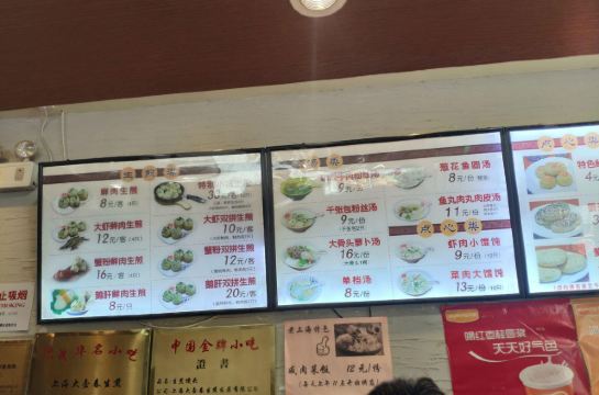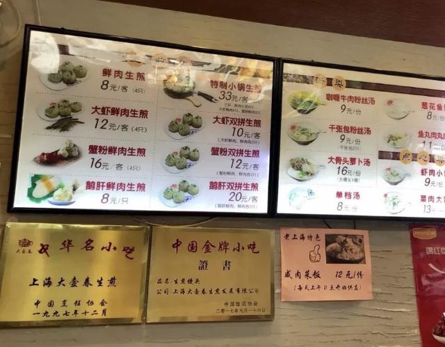 虾肉生煎,排骨年糕,咖喱牛肉汤,老上海三丝春卷,鲜虾小馄饨,千张包粉丝汤,蛋黄鲜肉月饼,鹅肝生煎,咖喱牛肉粉丝汤,葱花鱼圆汤,大虾生煎,单档汤,肉松青团,菜肉大馄饨,鲜肉小馄饨,特制铁锅生煎,冷面,小馄饨,炸猪排,鲜肉月饼,蟹壳黄,青团,生煎